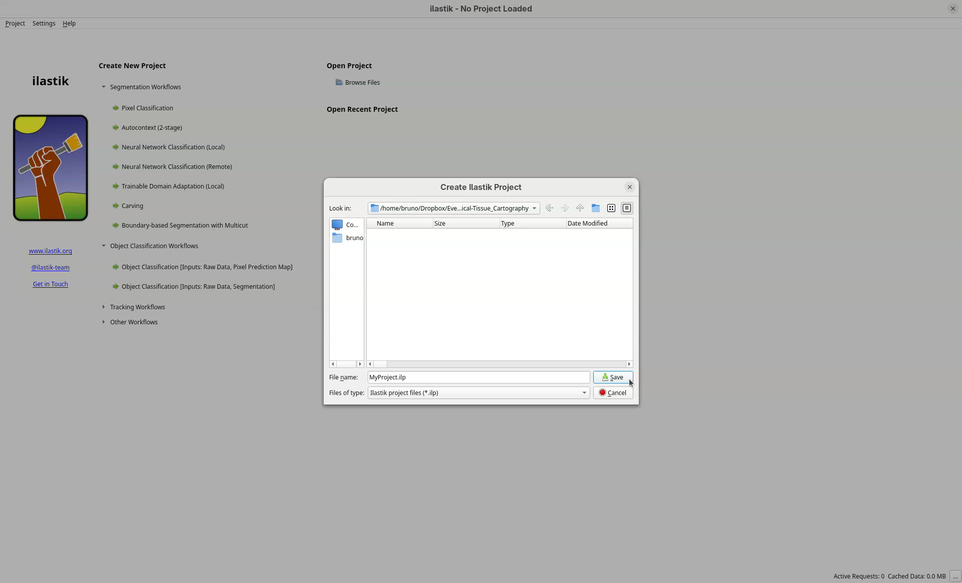 The window Create Ilastik Project will open.