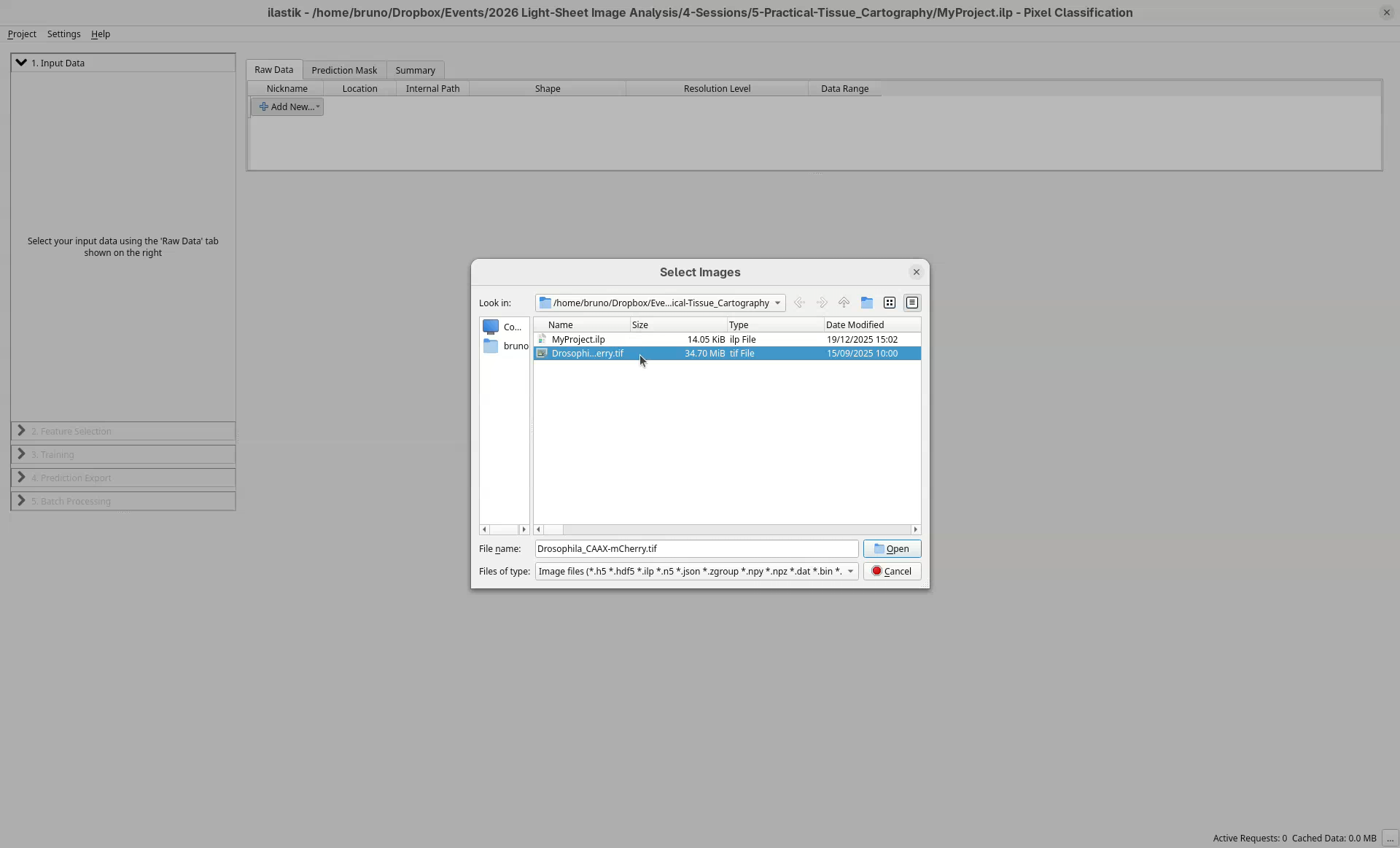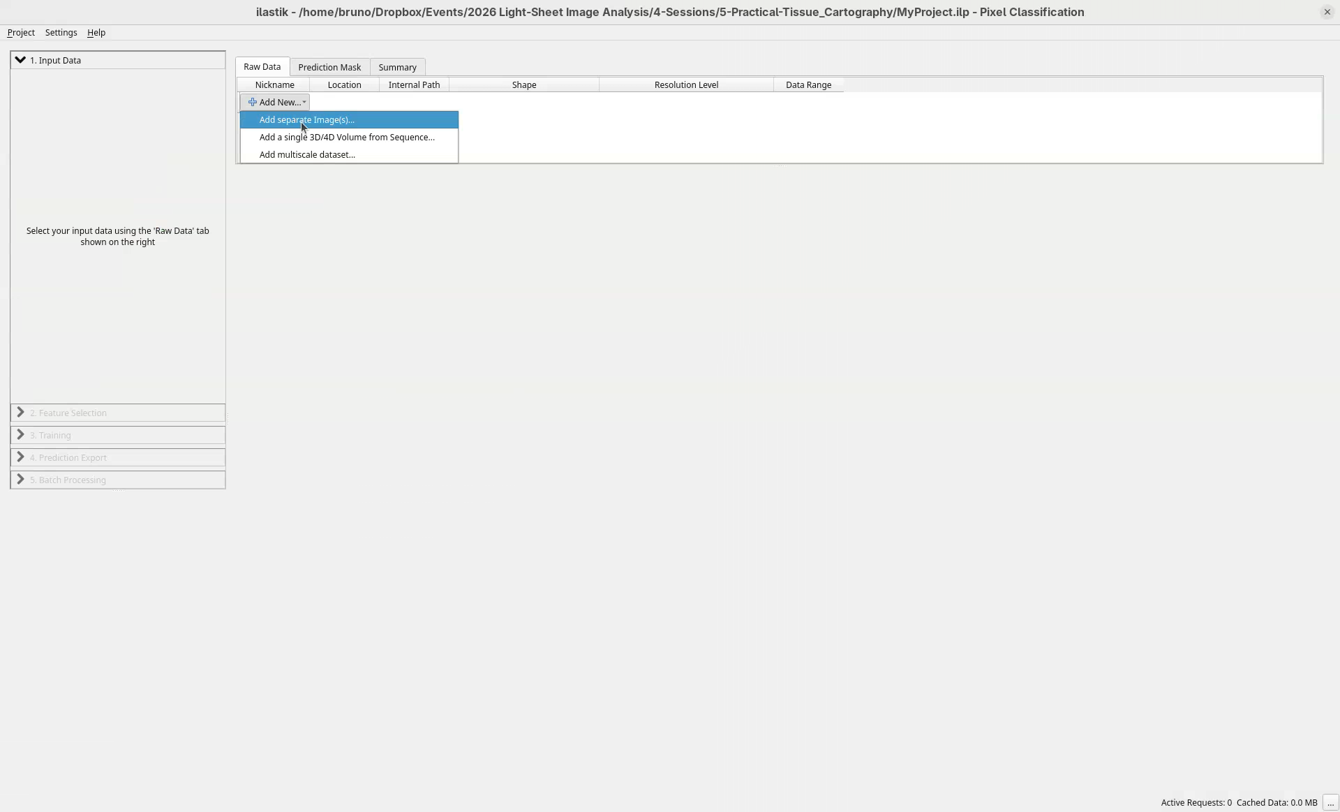 The ilastik interface is ready to define our input data.