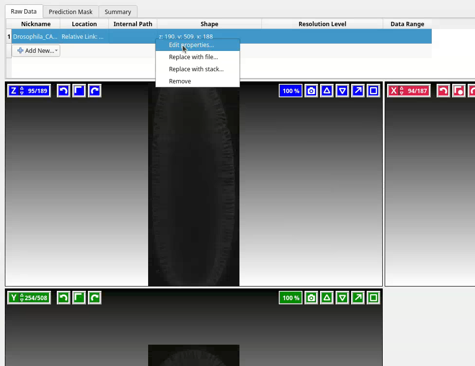 ilastik will open the dataset in three orthogonal views: XY (blue), XZ (green), YZ (red).