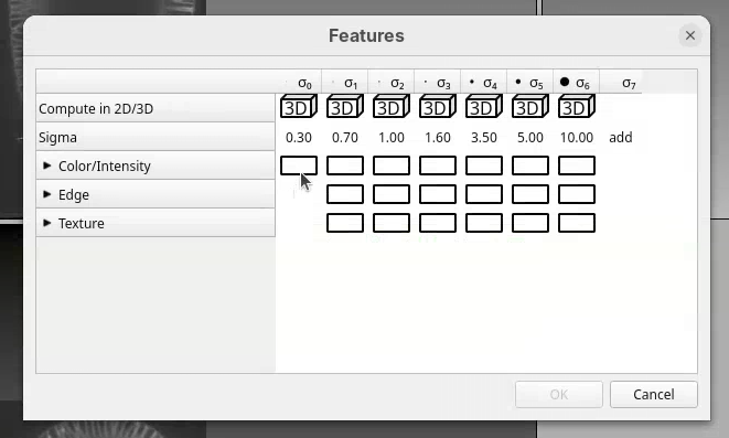Next we need to select the image features to take into account for the segmentation.