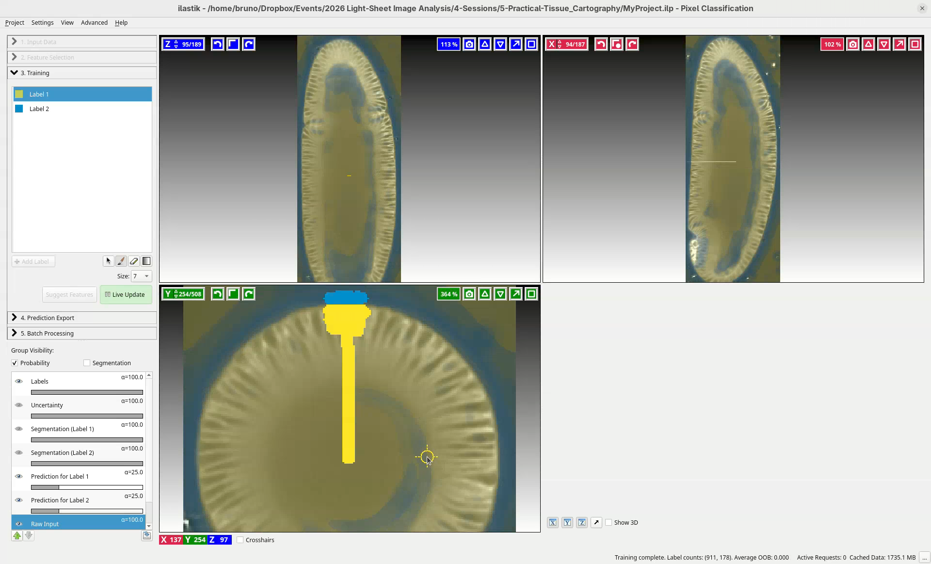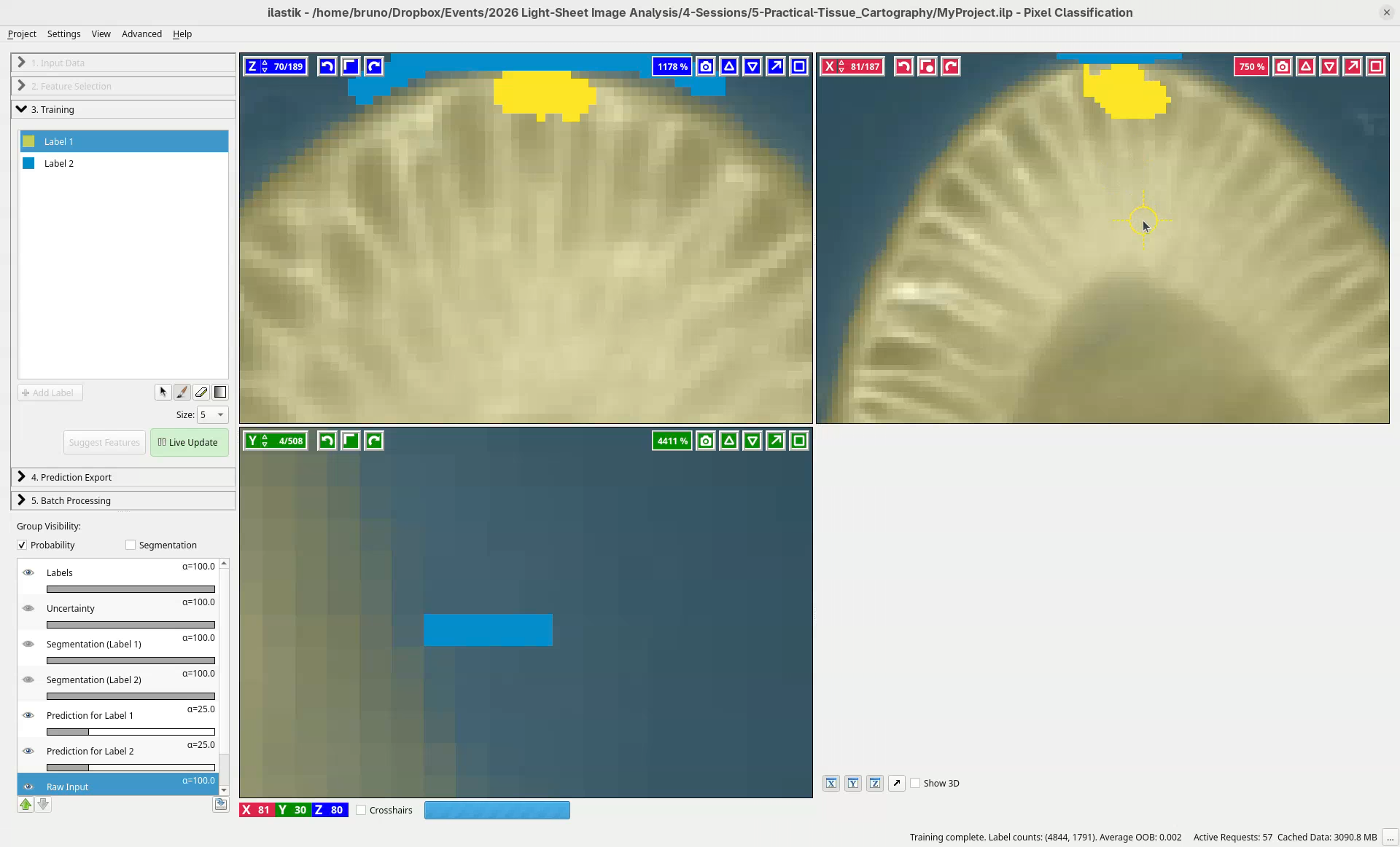 This is enough to get started. Based on these simple strokes, ilastik will learn and apply this to the entire dataset.