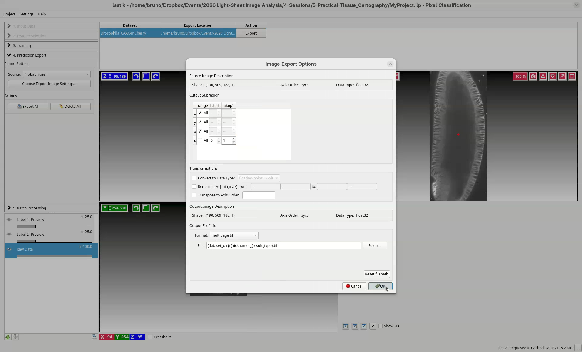 Layoutworkspace, select bothDrosophila_CAAX-mCherry_BoundingBoxandDrosophila_CAAX-mCherry_Probabilities_c0underScene Collection>Collectionagain, then click onSave Projection.