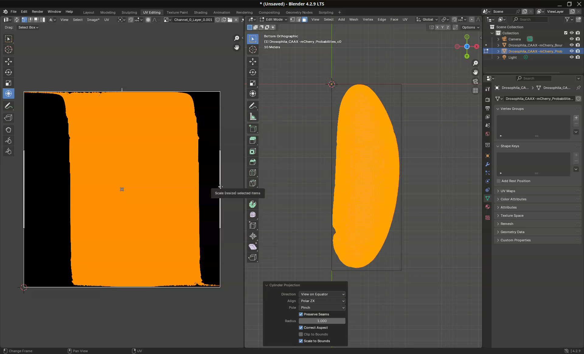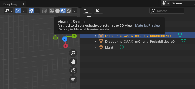 Layoutworkspace, select bothDrosophila_CAAX-mCherry_BoundingBoxandDrosophila_CAAX-mCherry_Probabilities_c0underScene Collection>Collection, and change the optionNormal Offs...(Normal Offsets (µm)) to5to match theVertex Shader Normal Offset (µm)option.