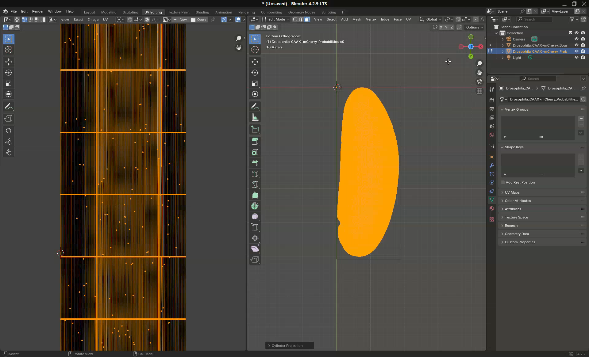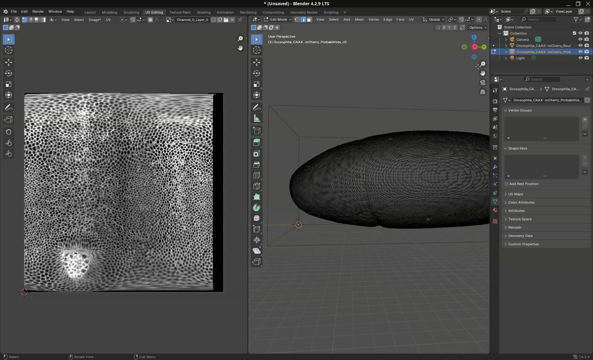 So, what happened here? We projected the sample mesh to 2D using the cylinder approach. Then the add-on Blender Tissue Cartography used this projected mesh to create a projection of the image data from the original stack. Quite nice!