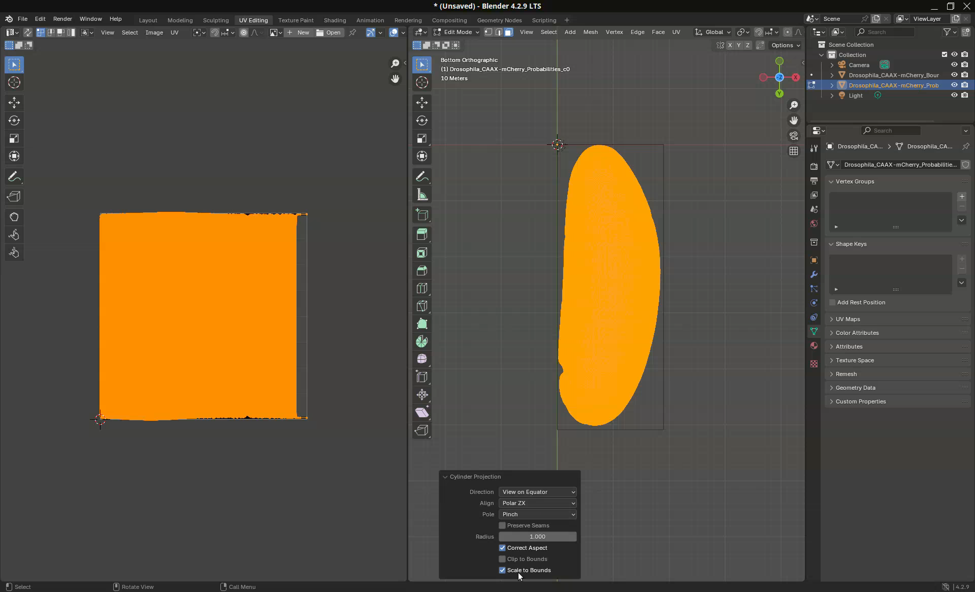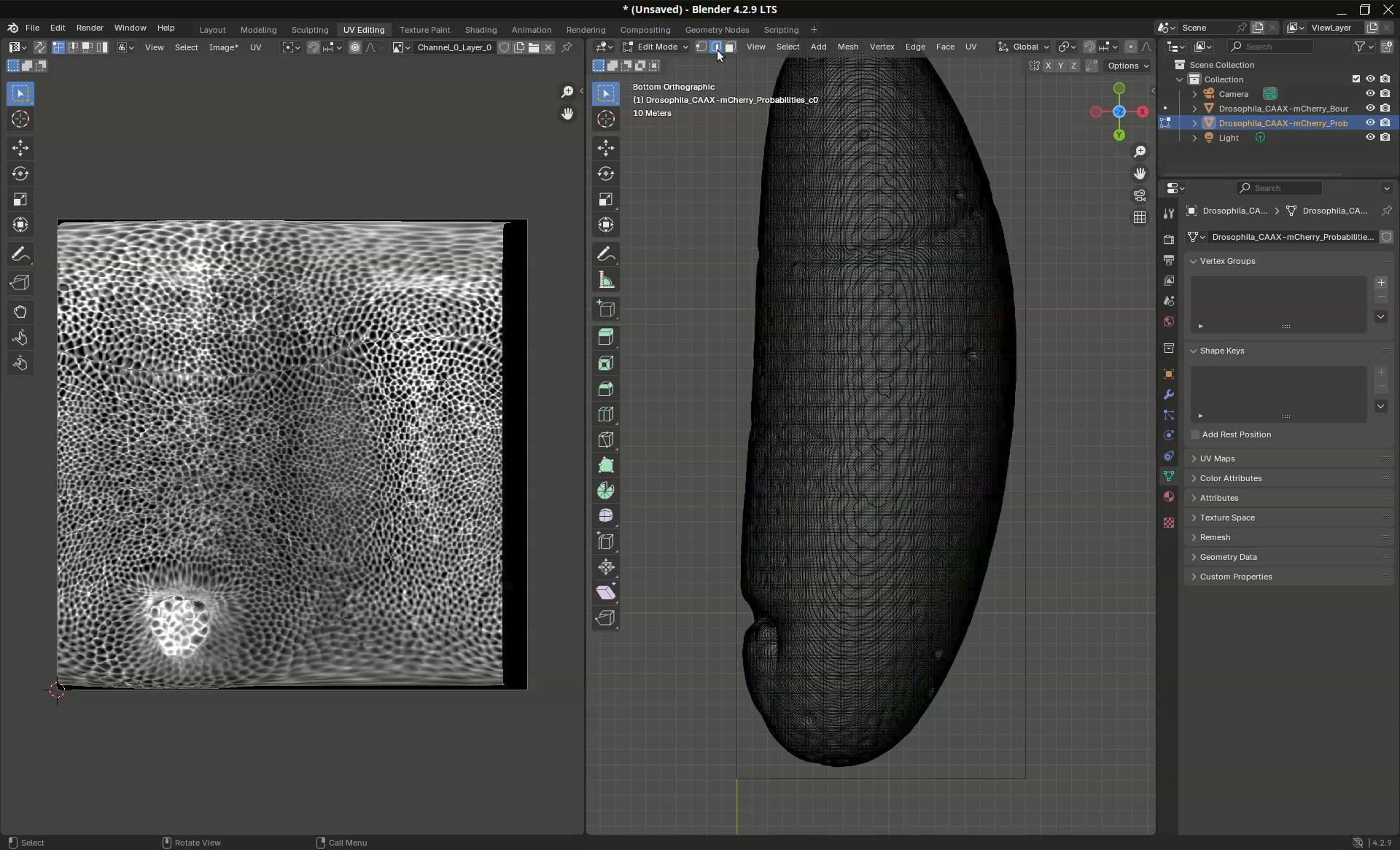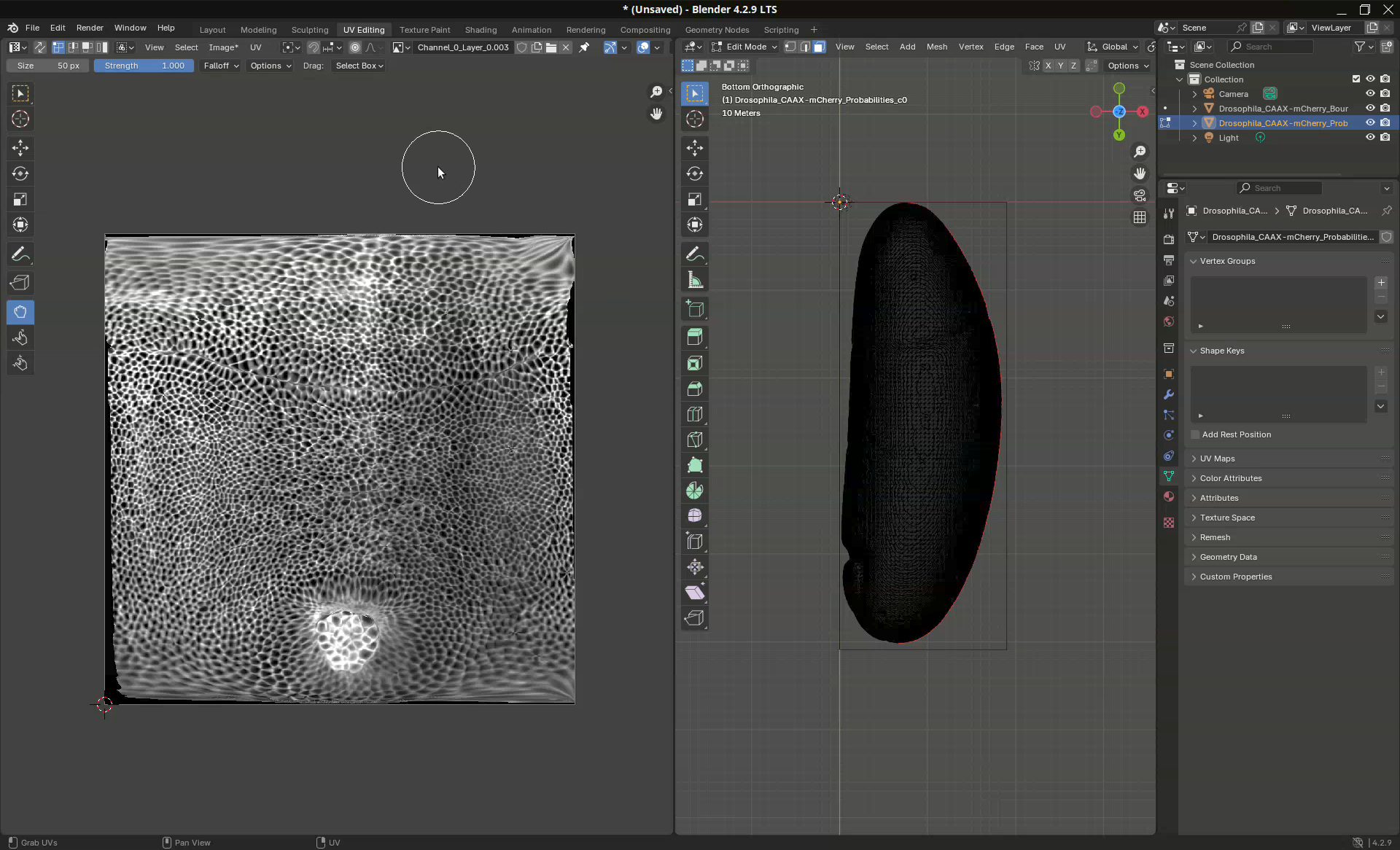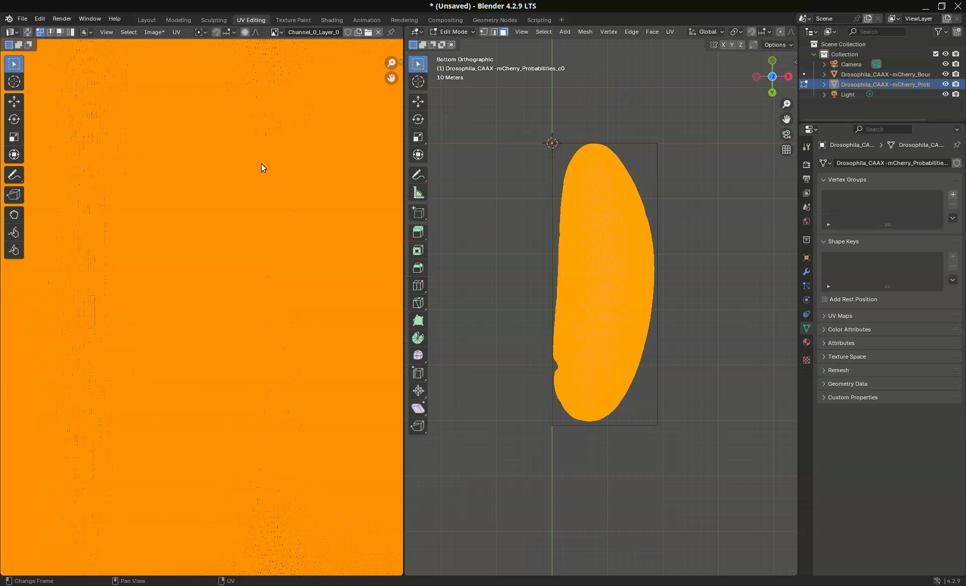 Another common use case is to be able to determine where the mesh will unwrap. This might be important for downstream analyses. In our sample, for example, the projection put the dorsal side on the left side (where a clump of germ cells are visible at the bottom) and the ventral side on the right side. However, let’s say that I need for my analyses the dorsal side at the center of the projection.