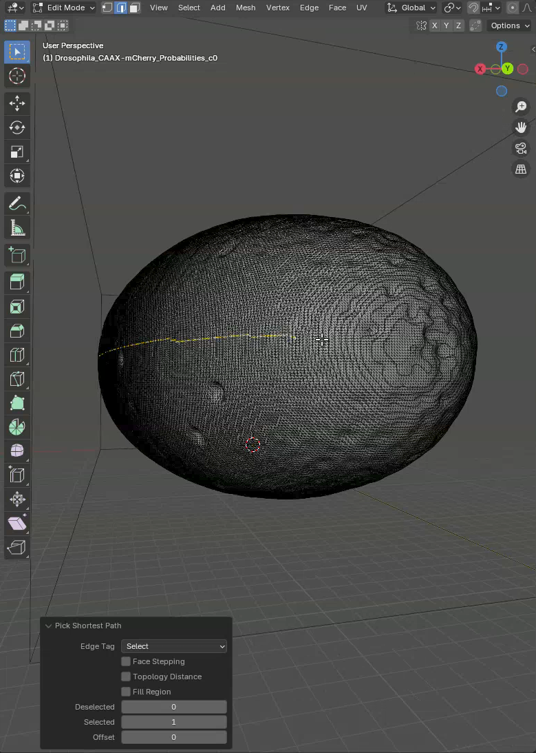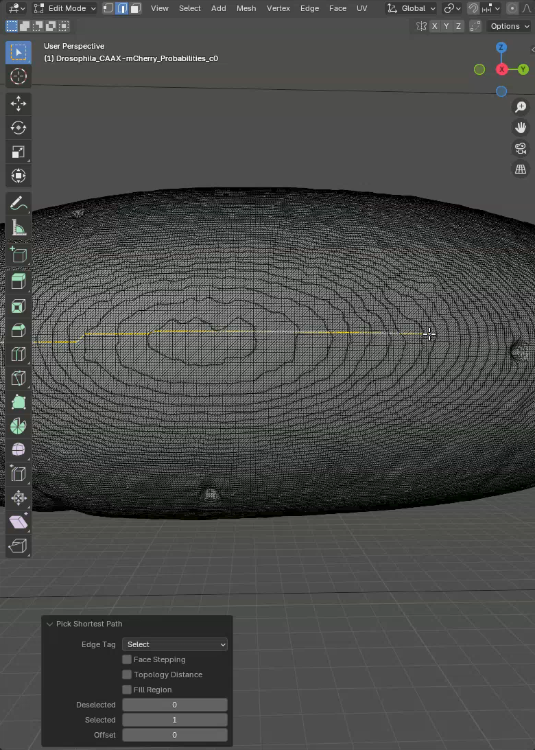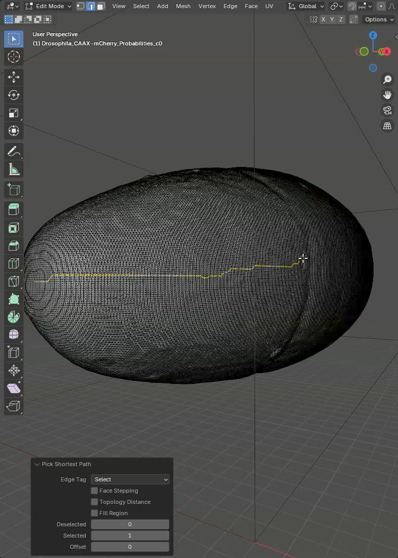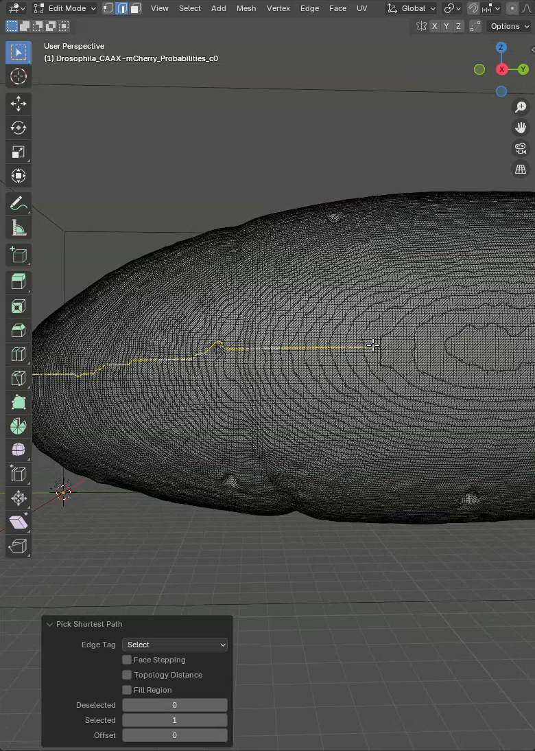 In this mode, when we click on the mesh an edge is selected and when we subsequently Ctrl+Click on another edge, the shortest path between the two edges will be selected. Like this we can quickly select a line along the sample to mark the unwrapping position. What we want is to trace a line through the ventral side of the sample. This is the region opposite to the germ cell clump.