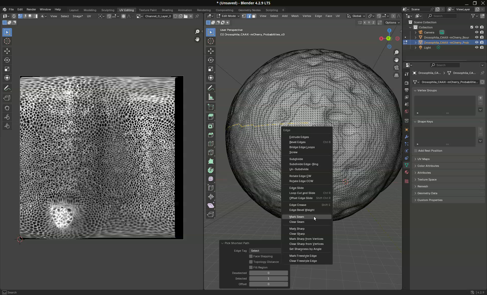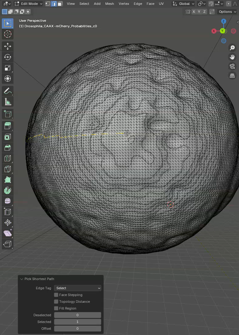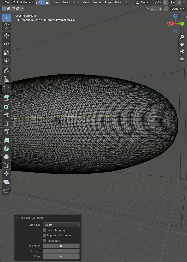 In this mode, when we click on the mesh an edge is selected and when we subsequently Ctrl+Click on another edge, the shortest path between the two edges will be selected. Like this we can quickly select a line along the sample to mark the unwrapping position. What we want is to trace a line through the ventral side of the sample. This is the region opposite to the germ cell clump.