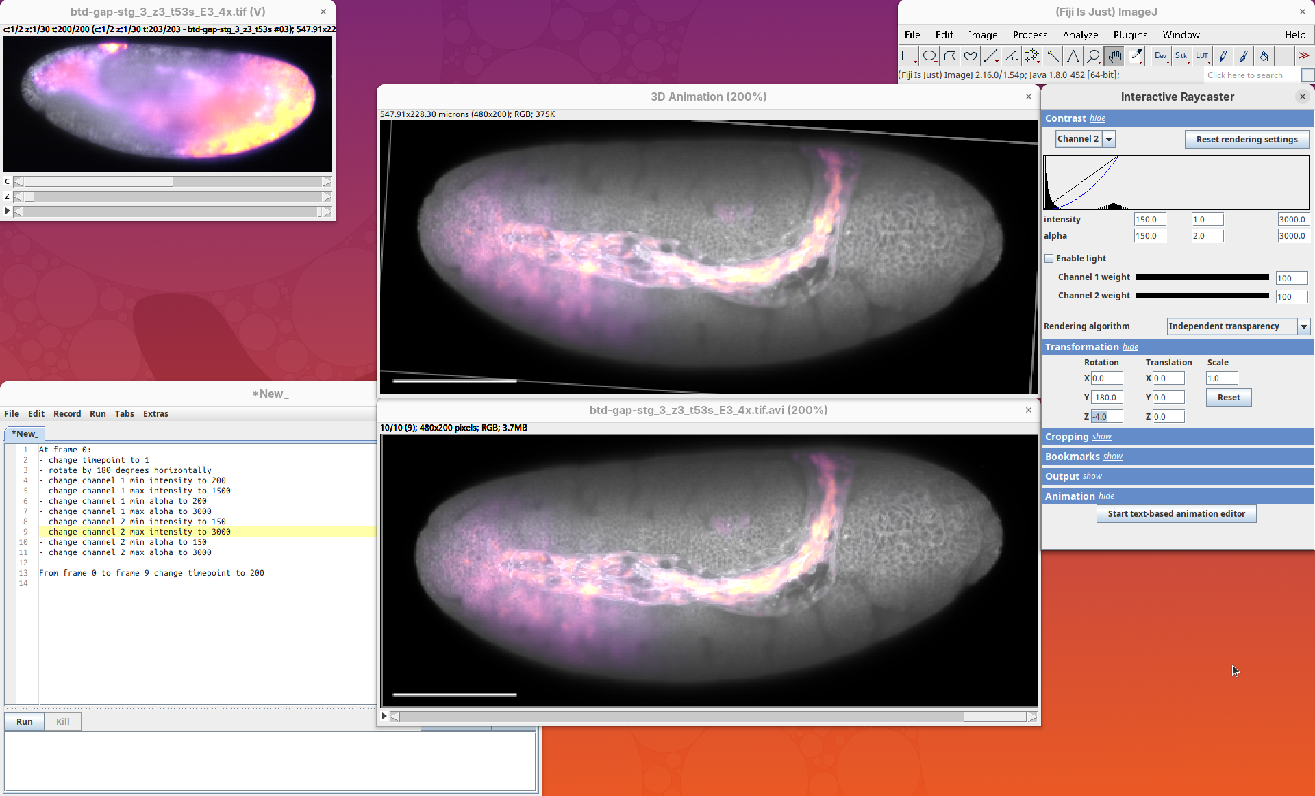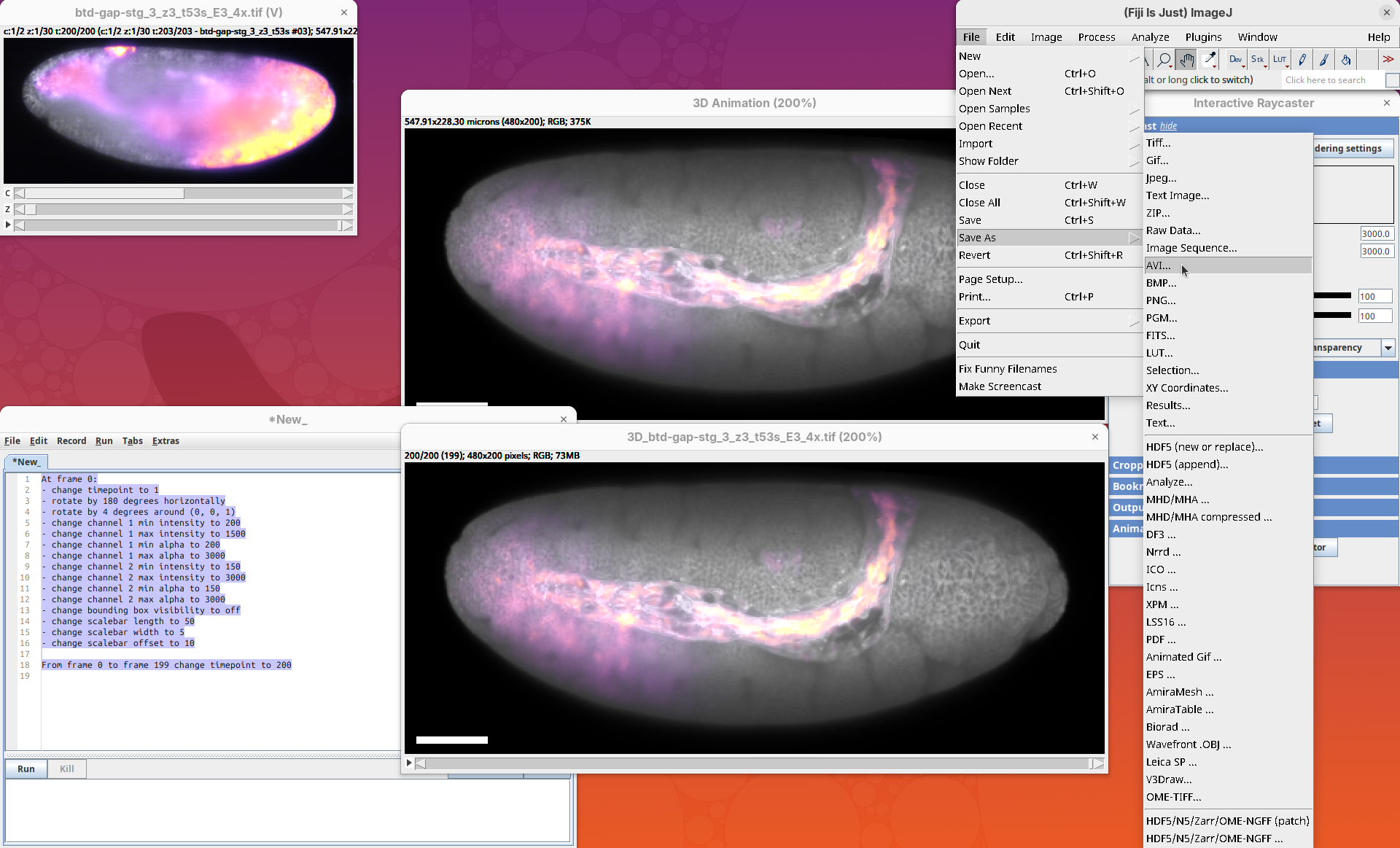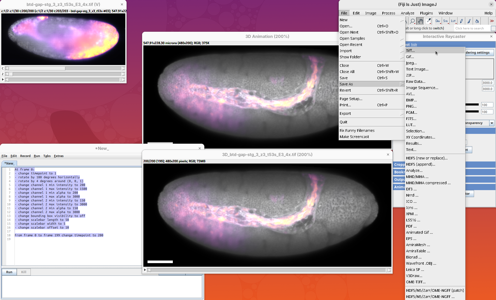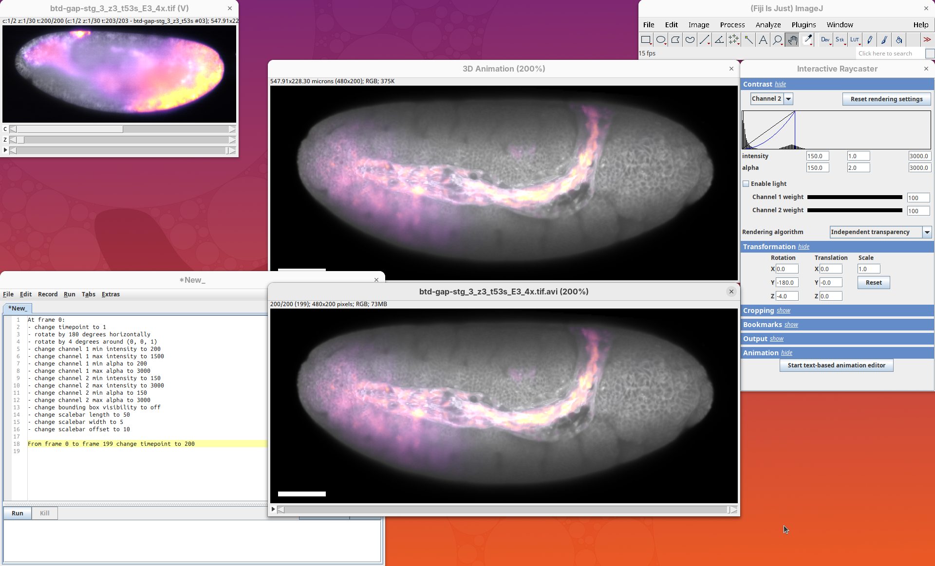 3Dscript is a GPU-accelerated Fiji plugin to generate animations of 3D/4D data (Schmid et al. 2019). It supports stacks with multiple channels and timepoints, has several options to control the rendering appearance, allows custom transformations and cropping of the data, and generates animations using a natural language, which is great to have precise control over the animation. 3Dscript is also incredibly fast to generate the animations and doesn’t require a lot of memory since the datasets can be opened as virtual stacks (more about this below).