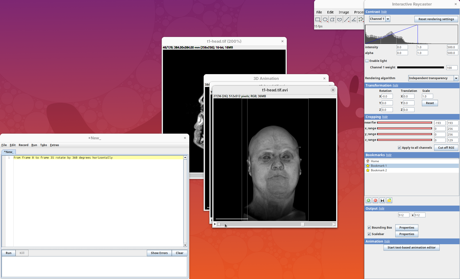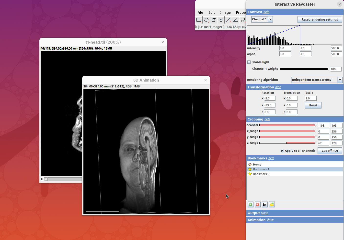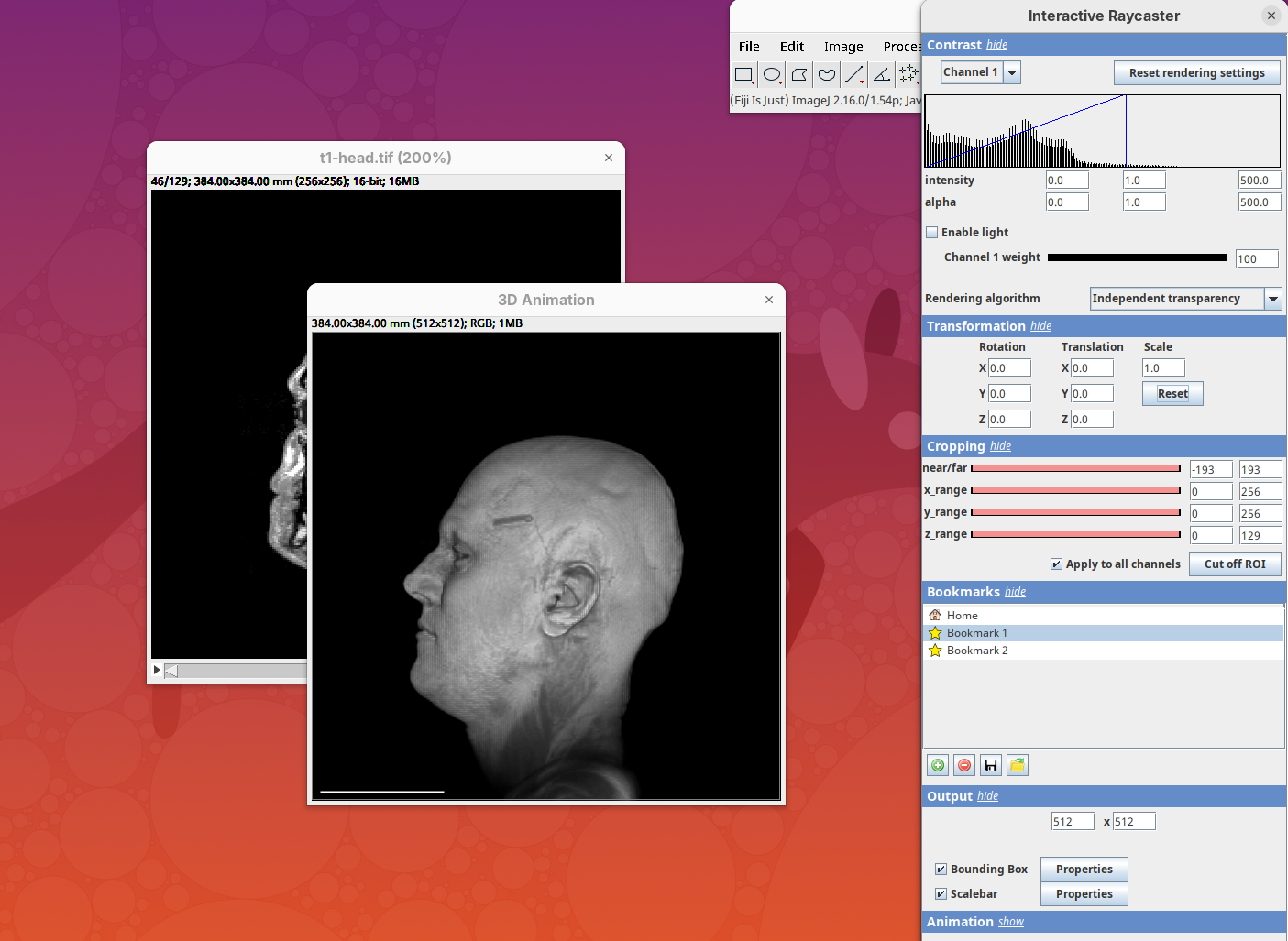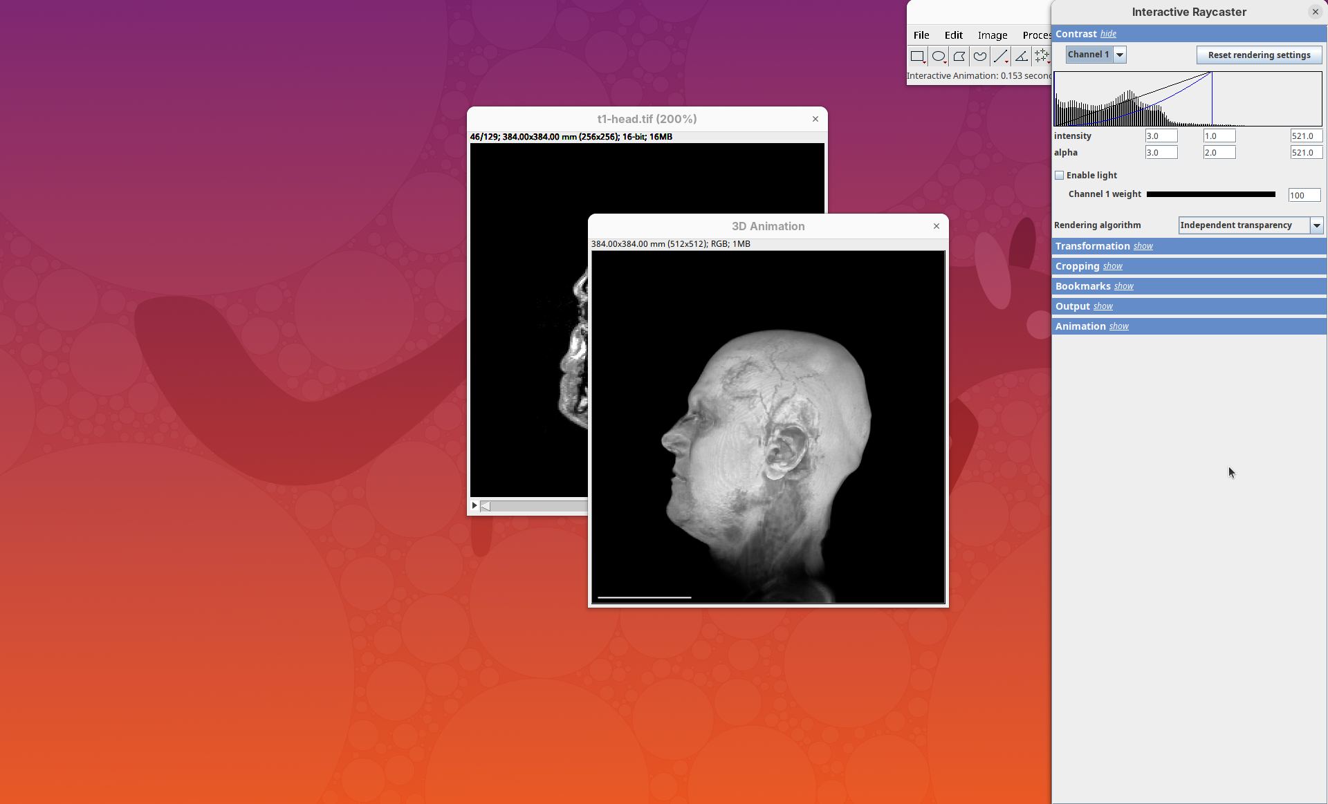 Two new windows will open: 3D Animation with the initial rendering of the data and Interactive Raycaster with all the fields to control the rendering parameters.