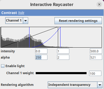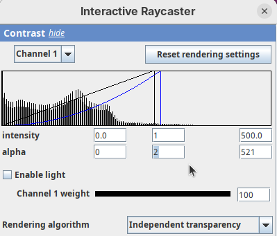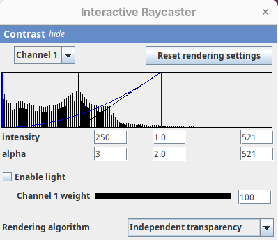 The Contrast section shows a histogram of pixel intensities of the image for each channel, which we can choose using the dropdown menu. We can set the minimum, gamma, and maximum values for the intensity and alpha (transparency) properties of each pixel. The weight option controls the general opacity of the channel (0=invisible, 100=visible). There’s also more advanced options like lighting and rendering algorithm which we’ll simply use the default states as they are usually good for most use cases.