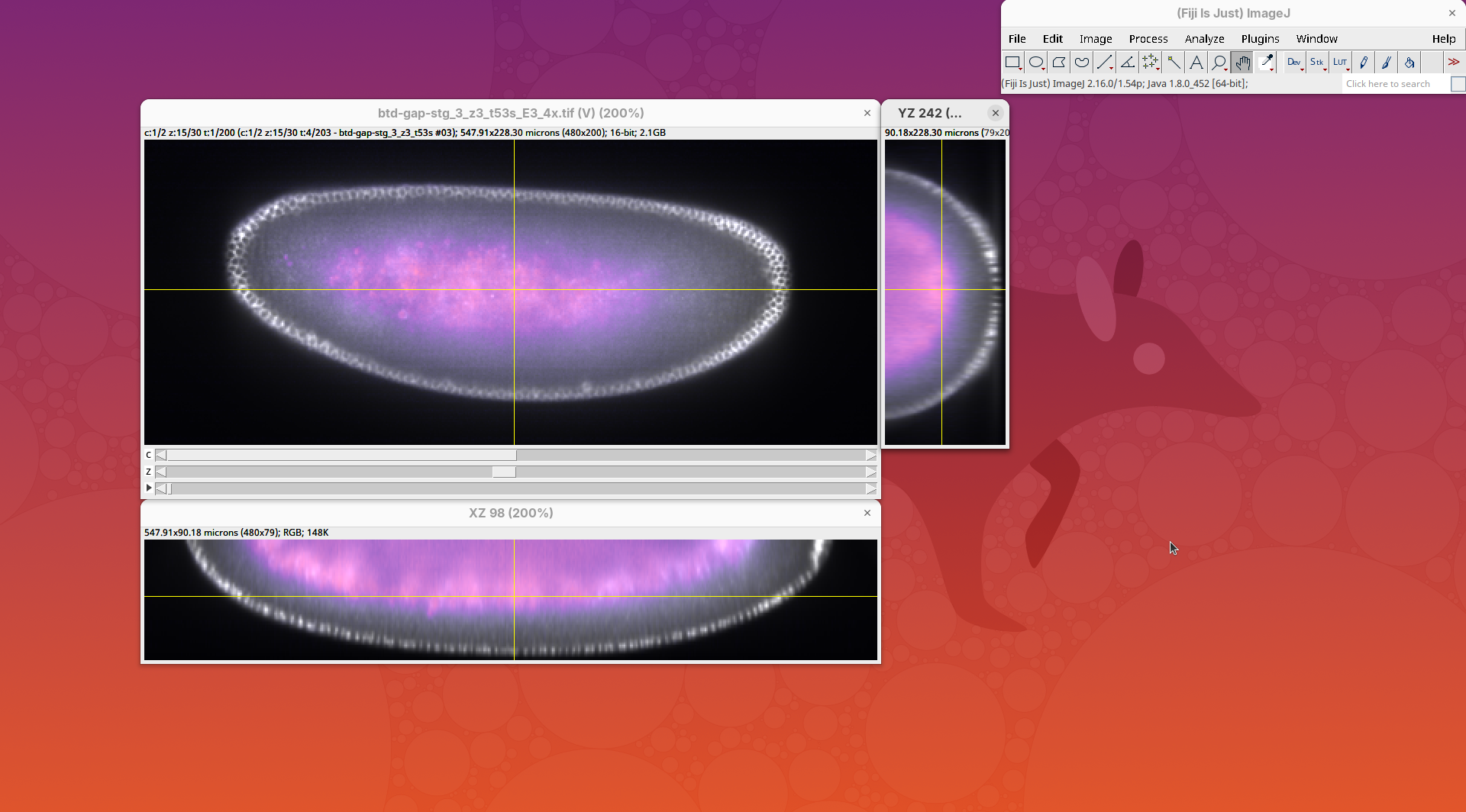 Orthogonal Views is a tool that shows the optical sections through the orthogonal planes of XY: XZ and YZ. It is an easy and quick way to get a sense of the tridimensionality of your dataset. Whenever I’m opening a dataset for the first time I use Orthogonal Views. To activate it: