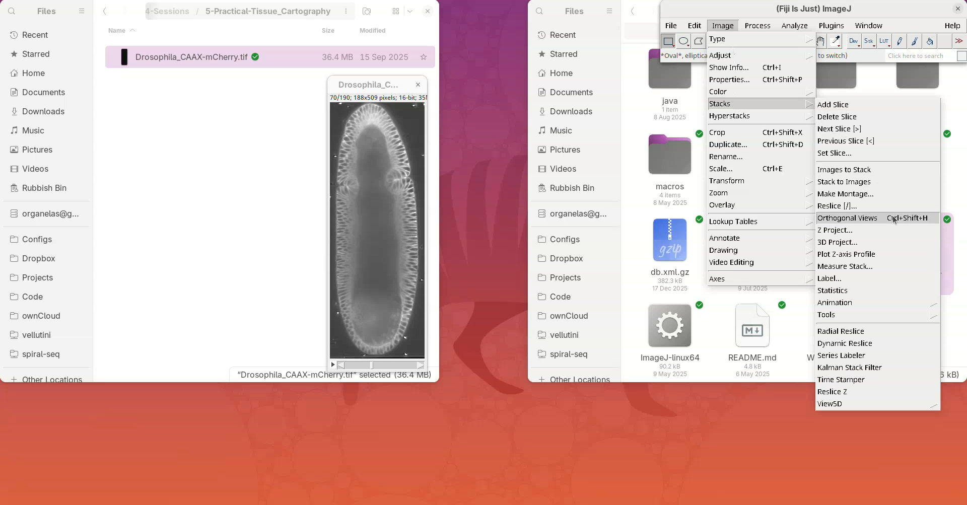 - Once done, close the orthogonal views and stack (leave Fiji open).