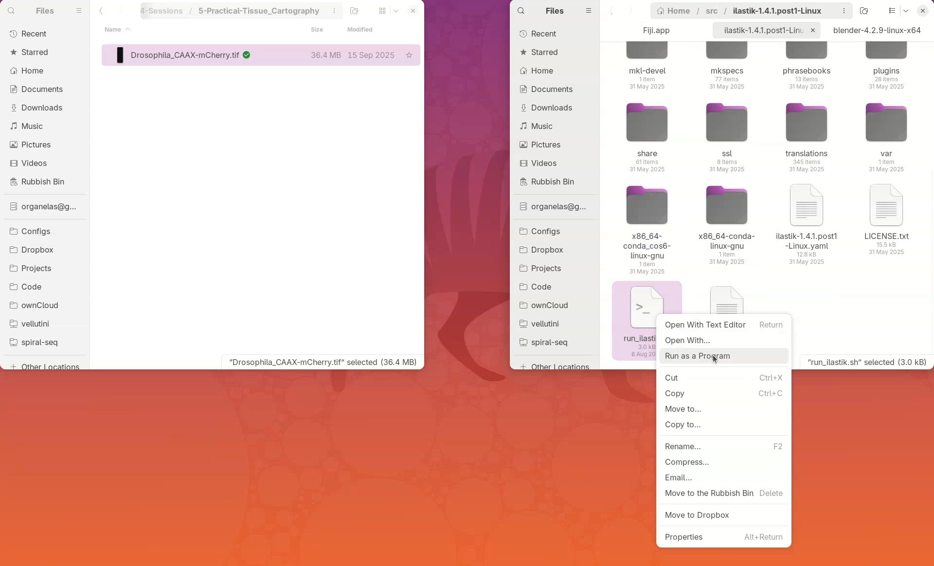 ilastik-1.4.1.post1-Linux, right-click the filerun_ilastik.sh, and selectRun as a Programto open ilastik.