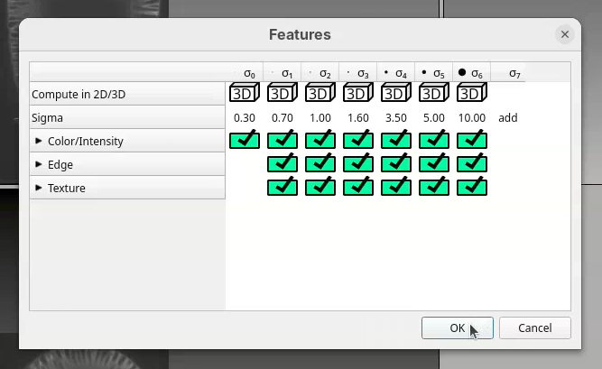 Next we need to select the image features to take into account for the segmentation.