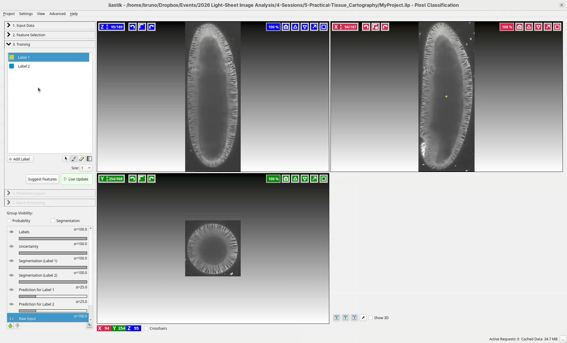 ilastik will open the dataset in three orthogonal views: XY (blue), XZ (green), YZ (red).