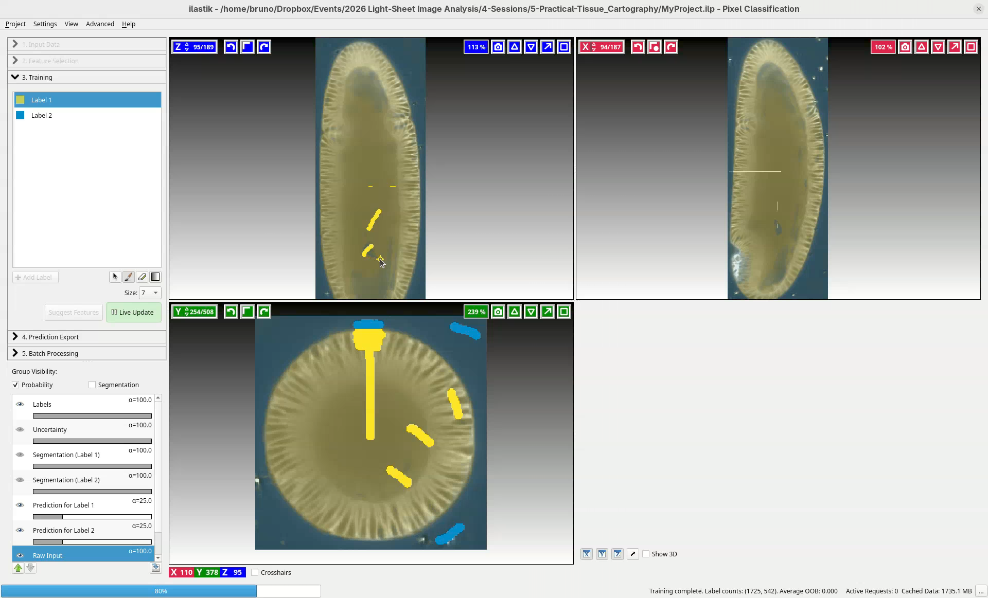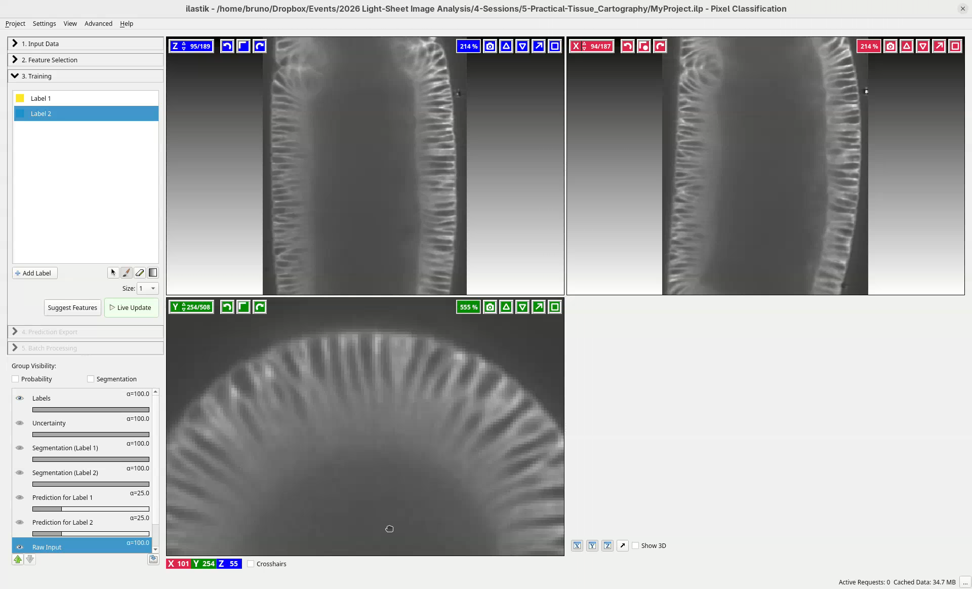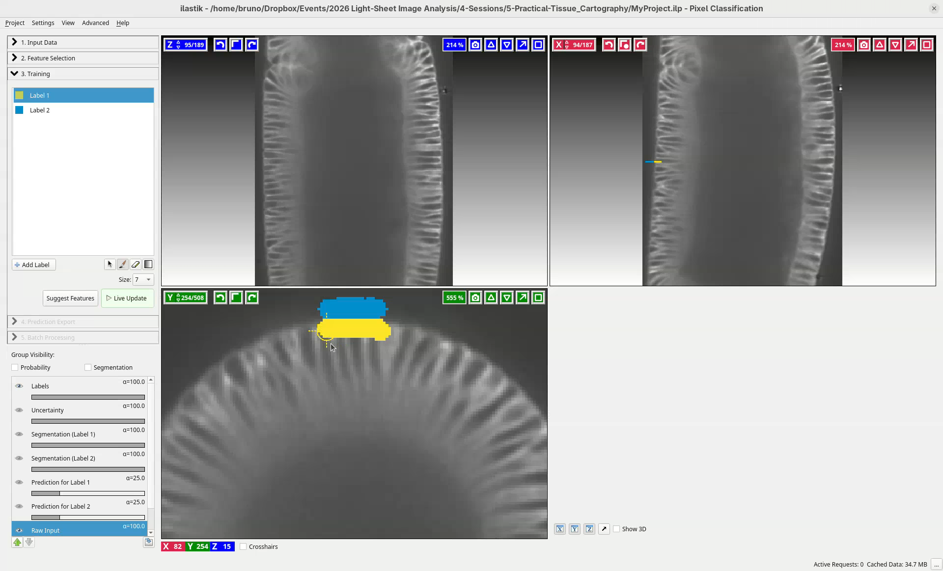 This is enough to get started. Based on these simple strokes, ilastik will learn and apply this to the entire dataset.