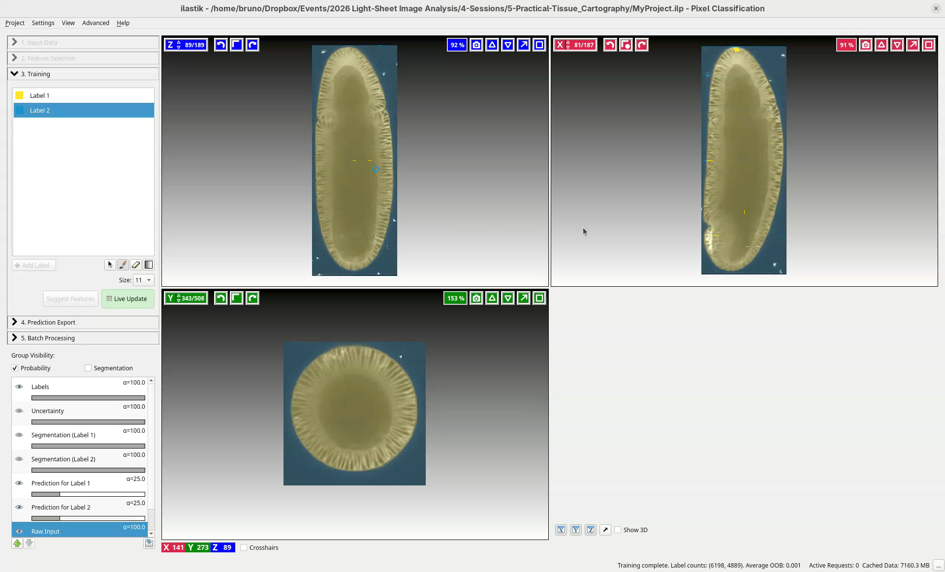 The first step we need is to segment the stack in 3D to distinguish what is tissue and what is background. This is required to create a 3D mesh in Blender that has the shape of the sample. To accomplish that, we will use ilastik.