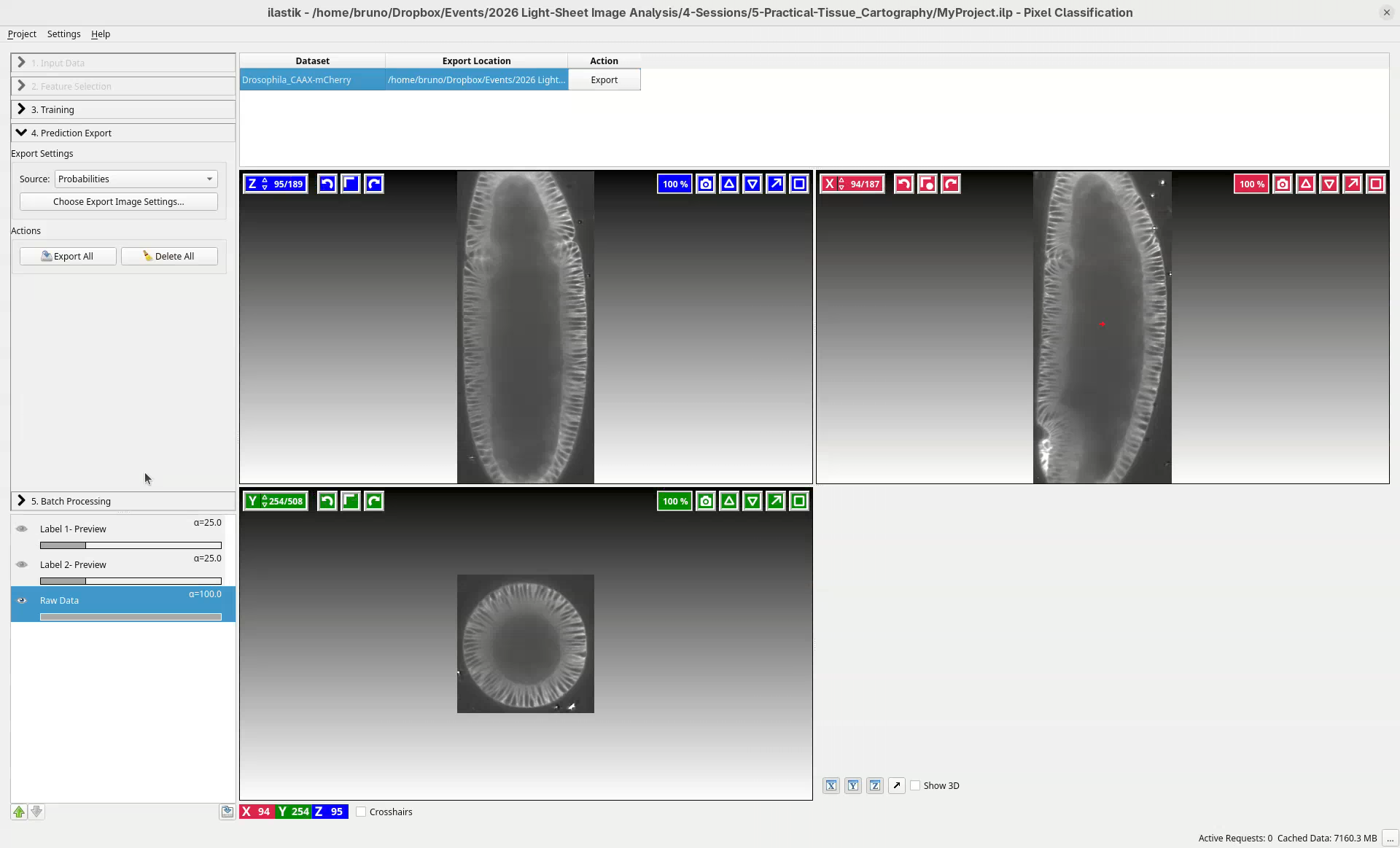 Layoutworkspace, select bothDrosophila_CAAX-mCherry_BoundingBoxandDrosophila_CAAX-mCherry_Probabilities_c0underScene Collection>Collectionagain, then click onSave Projection.