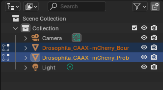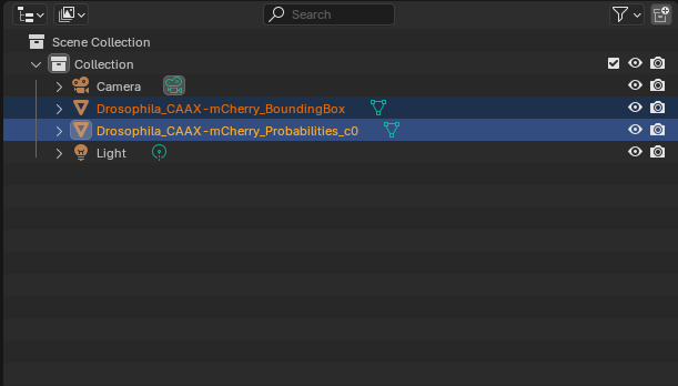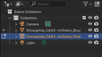 Layoutworkspace, select bothDrosophila_CAAX-mCherry_BoundingBoxandDrosophila_CAAX-mCherry_Probabilities_c0underScene Collection>Collection, and change the optionNormal Offs...(Normal Offsets (µm)) to5to match theVertex Shader Normal Offset (µm)option.