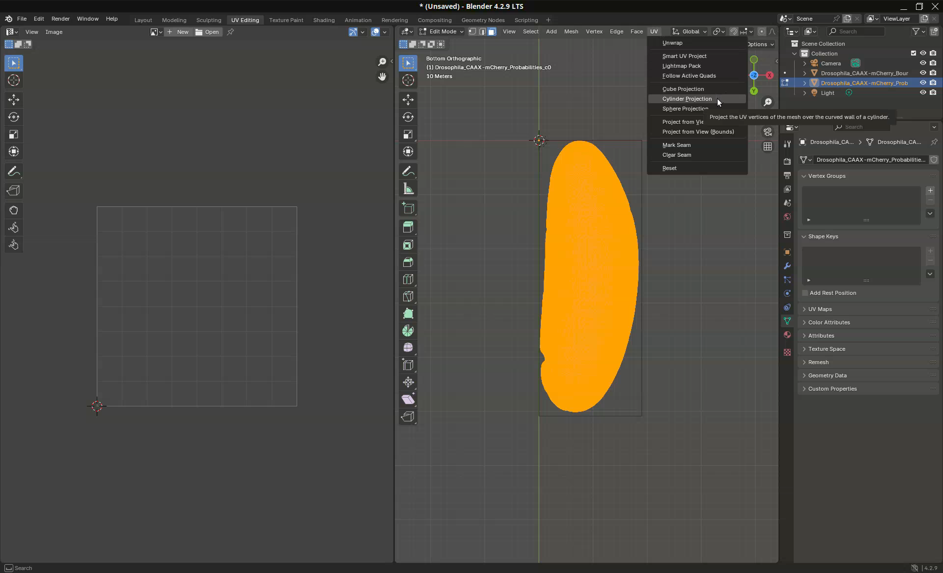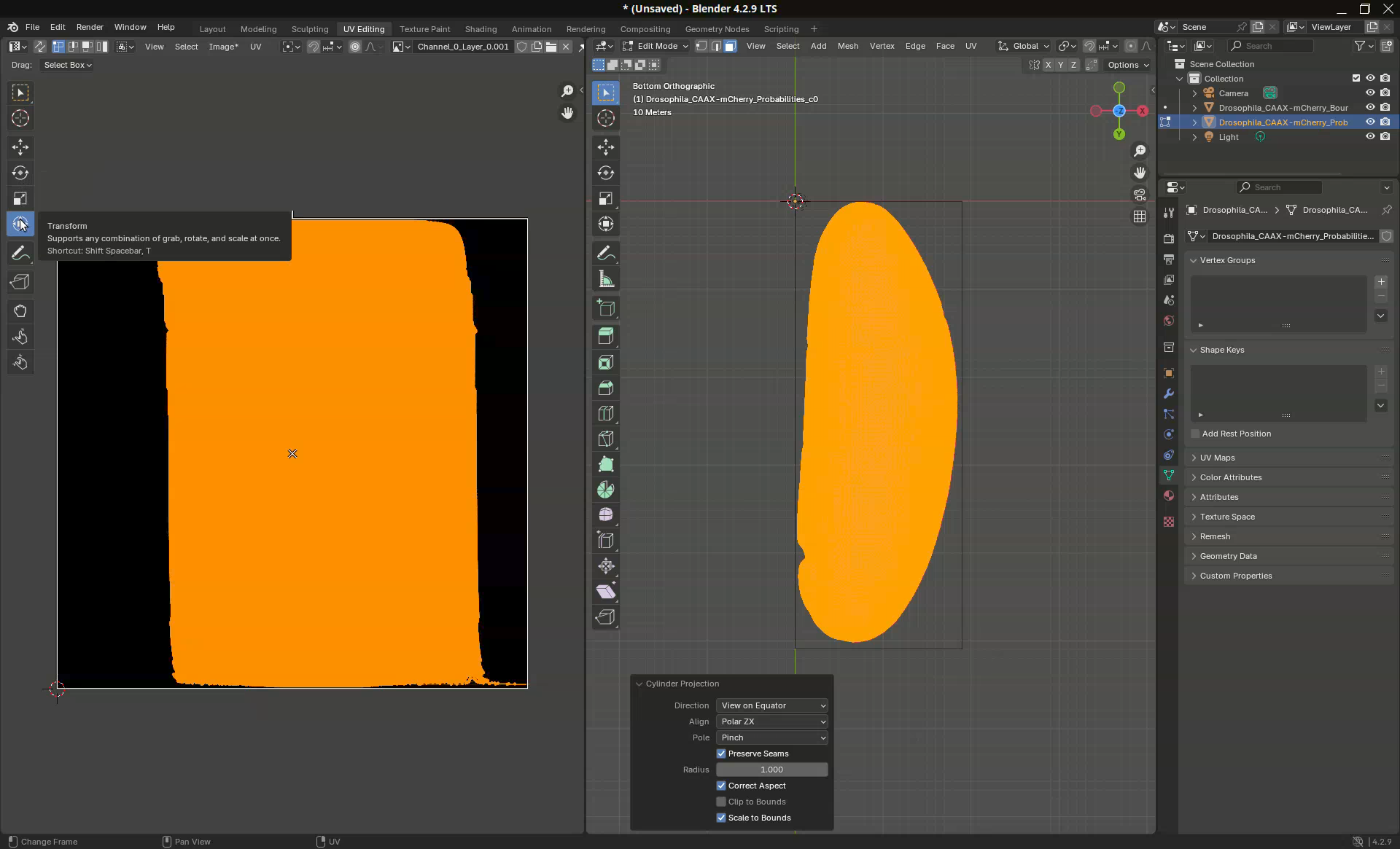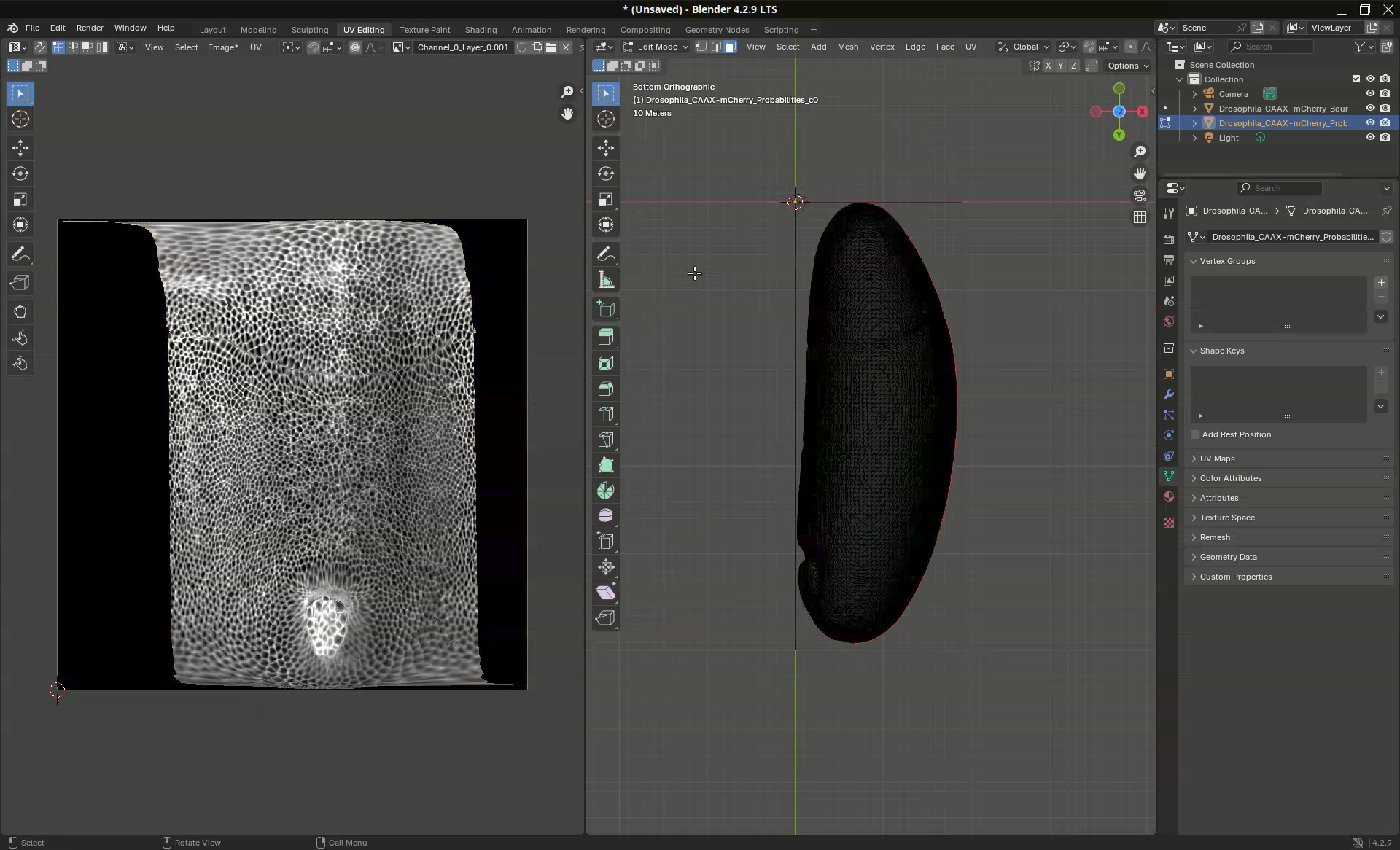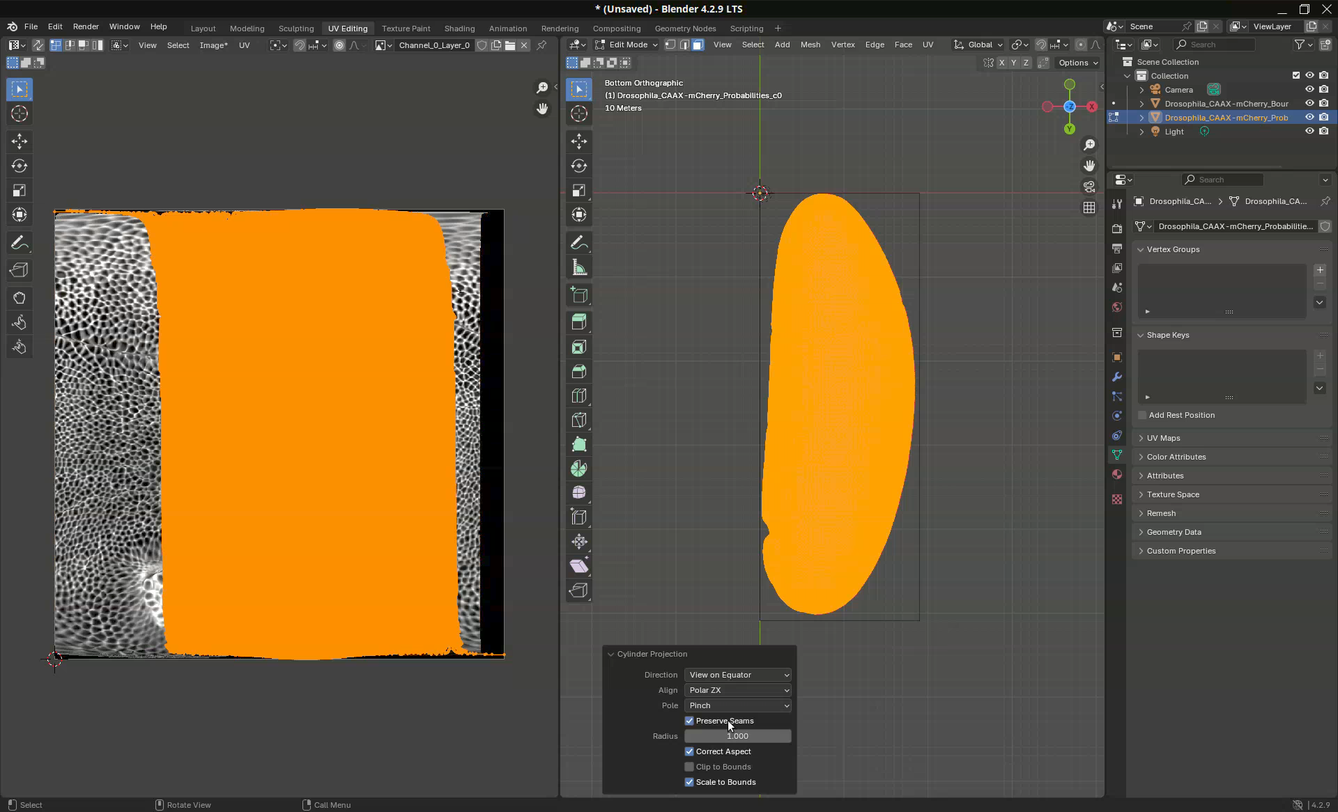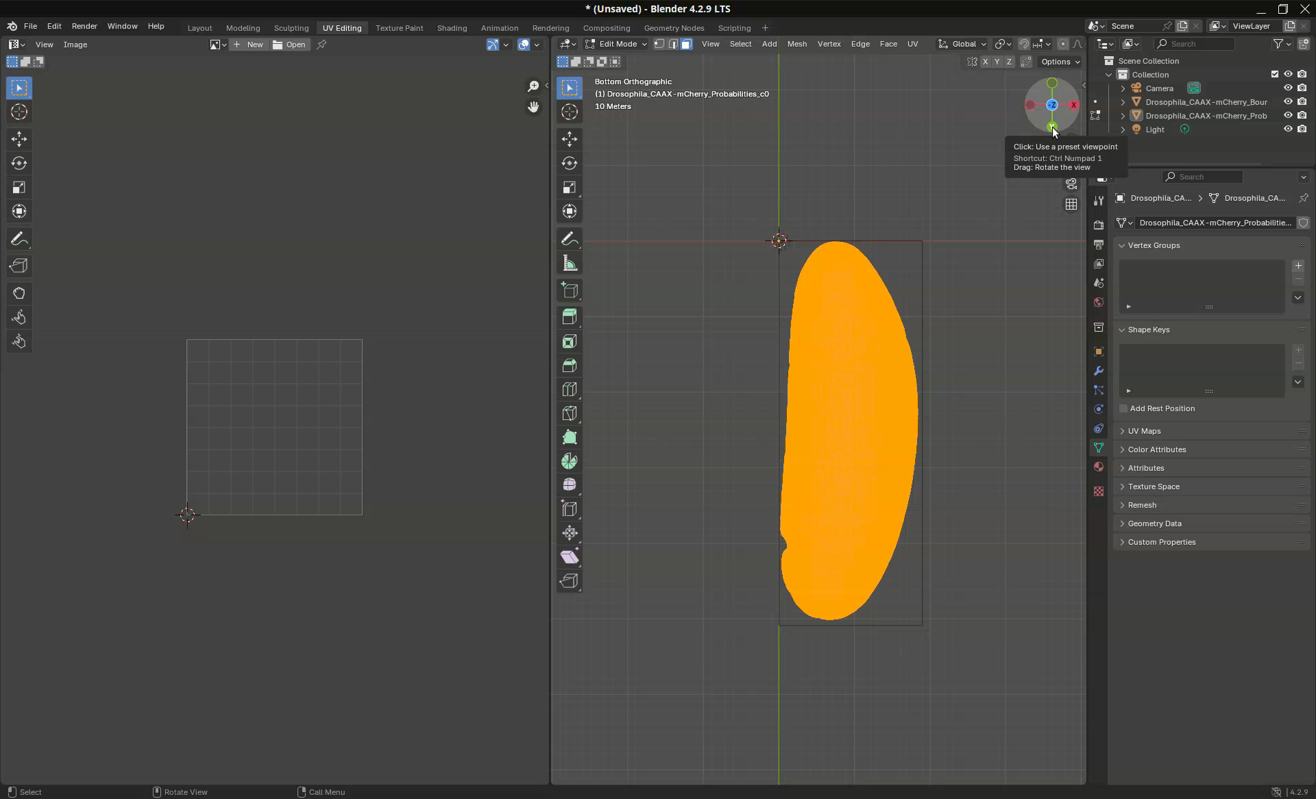 Another common use case is to be able to determine where the mesh will unwrap. This might be important for downstream analyses. In our sample, for example, the projection put the dorsal side on the left side (where a clump of germ cells are visible at the bottom) and the ventral side on the right side. However, let’s say that I need for my analyses the dorsal side at the center of the projection.