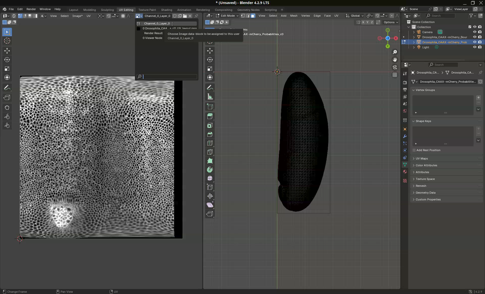 So, what happened here? We projected the sample mesh to 2D using the cylinder approach. Then the add-on Blender Tissue Cartography used this projected mesh to create a projection of the image data from the original stack. Quite nice!