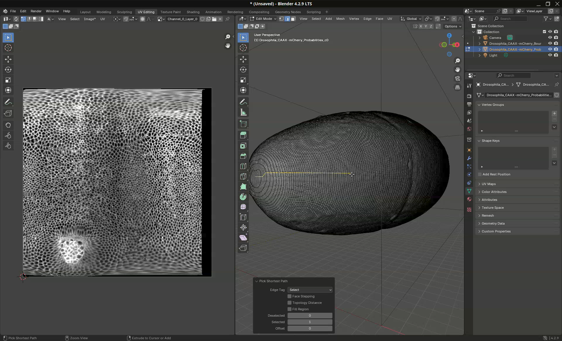 In this mode, when we click on the mesh an edge is selected and when we subsequently Ctrl+Click on another edge, the shortest path between the two edges will be selected. Like this we can quickly select a line along the sample to mark the unwrapping position. What we want is to trace a line through the ventral side of the sample. This is the region opposite to the germ cell clump.