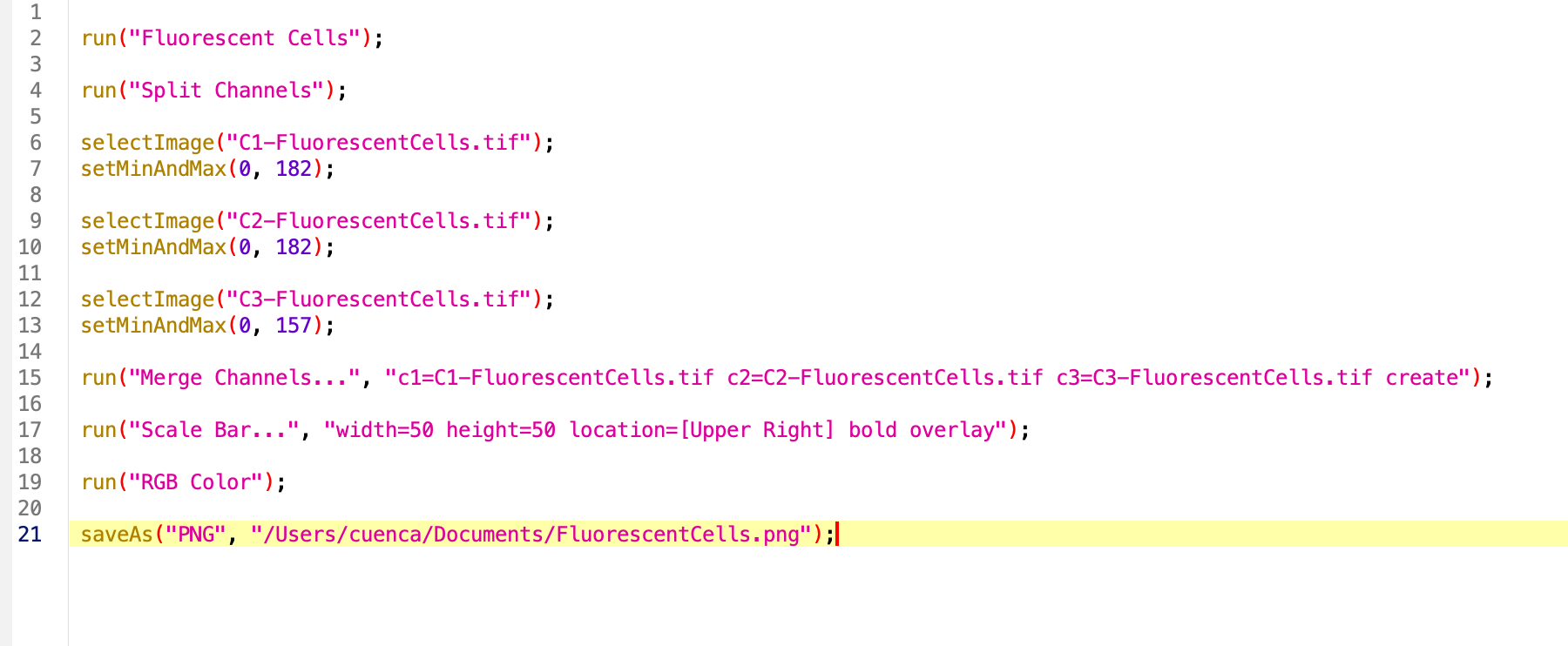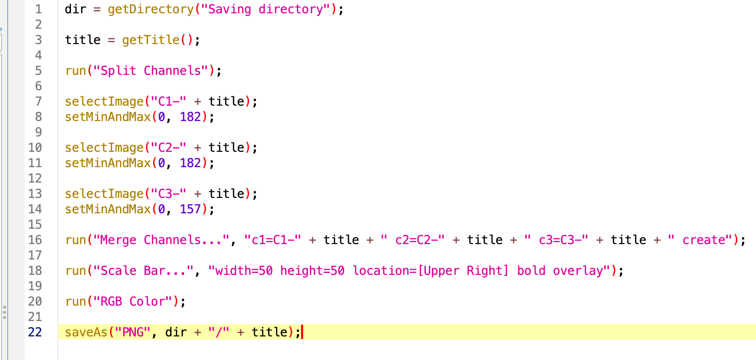 Next, the title of the opened image is being used throughout the code, it’s includded by default in the title of each channel after splitting, in the merge command and in the saveAs function. A good way to generalize the code is to create a variable with the title of the open image, whichever that is. For this wew use the function getTitle(). We can then replace VERY carefully, the title of the image by our variable.
