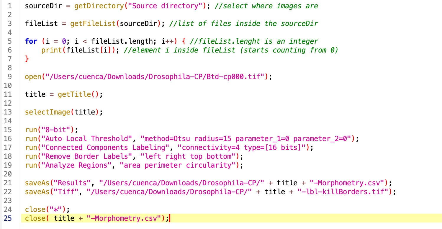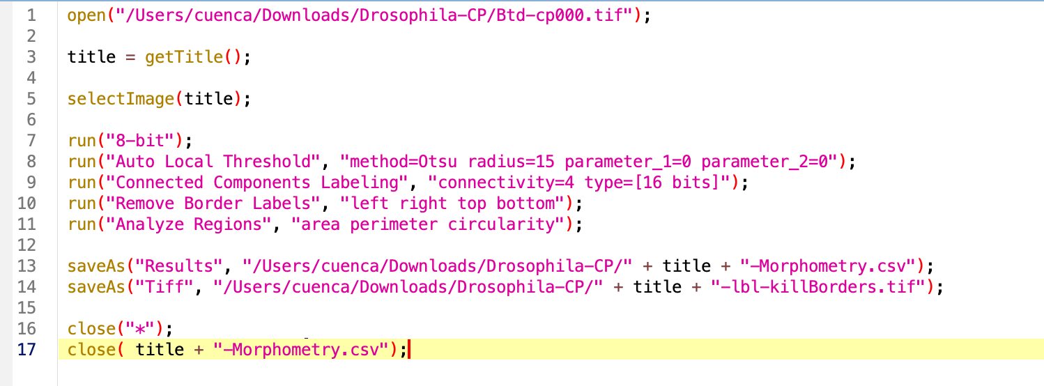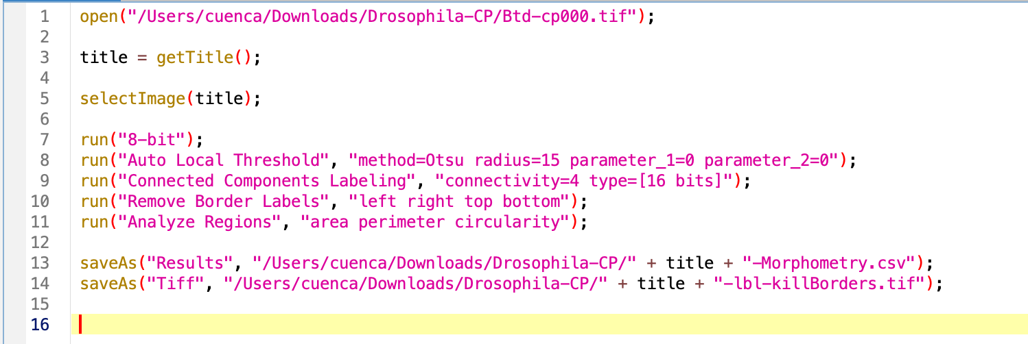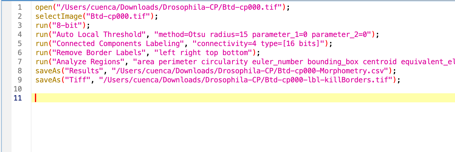 Note that the command run contains the instructions to run the specific functions in string format with a sintaxis that is very specific. Minor variations might occurr from MacOS/Ubuntu to Windows. Other commands such as saveAs include the specific title of the image we are processing, or directory where is being saved. We will pay attention to these when running the analysis in another image or directory.