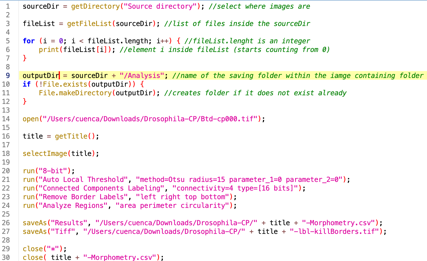 outputDir = sourceDir + "/Analysis"; //name of the saving folder within the iamge containing folder if (!File.exists(outputDir)) { File.makeDirectory(outputDir); //creates folder if it does not exist already }