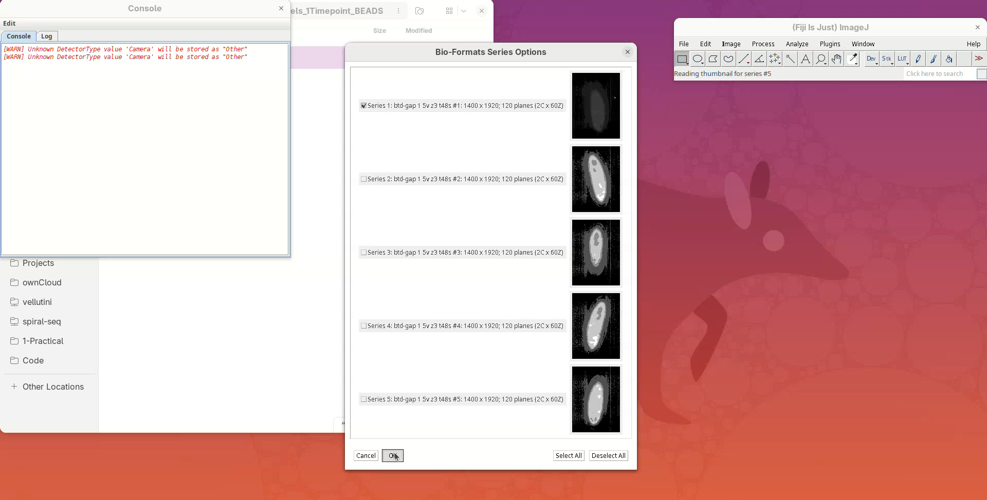 A Bio-Formats Series Options window will open. Bio-Formats recognized that this file contains more than one view (series) and is asking which ones do we want to open. We just want to inspect the first view since they will be quite similar.