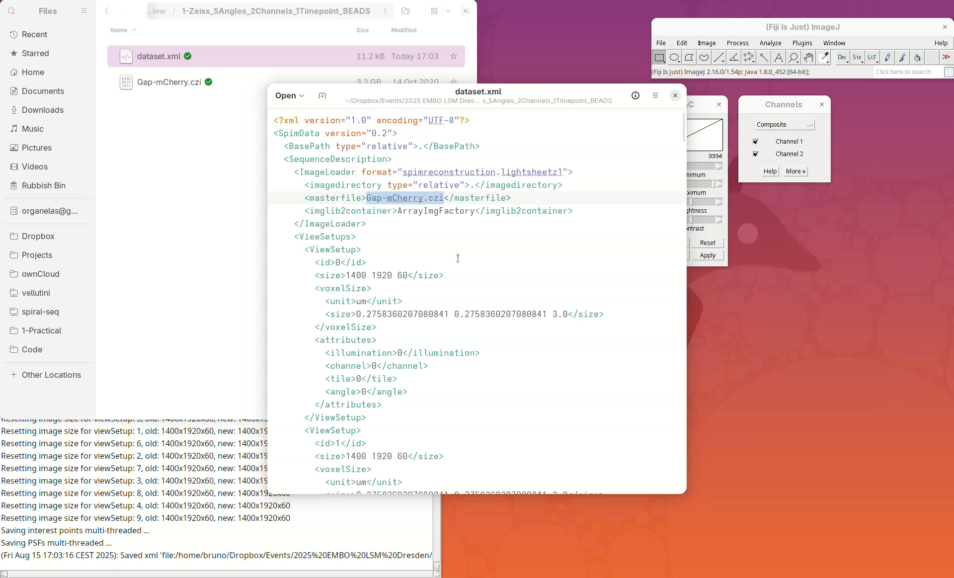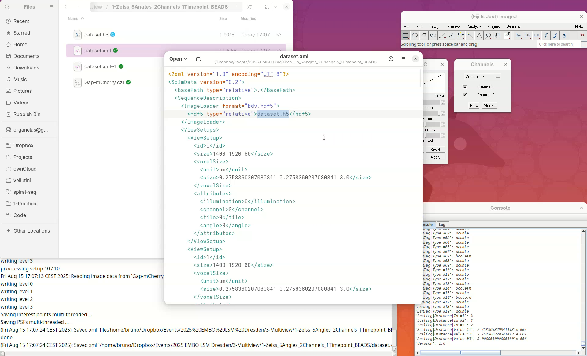 Note that another XML file named dataset.xml~1 and a new HDF5 file named dataset.h5 were created. Every time the dataset file is saved, BigStitcher creates a backup copy. dataset.xml~1 was the original dataset.xml which was renamed after the resaving. If we inspect the new dataset.xml in a Text Editor we will see that it now points to the dataset.h5 file.