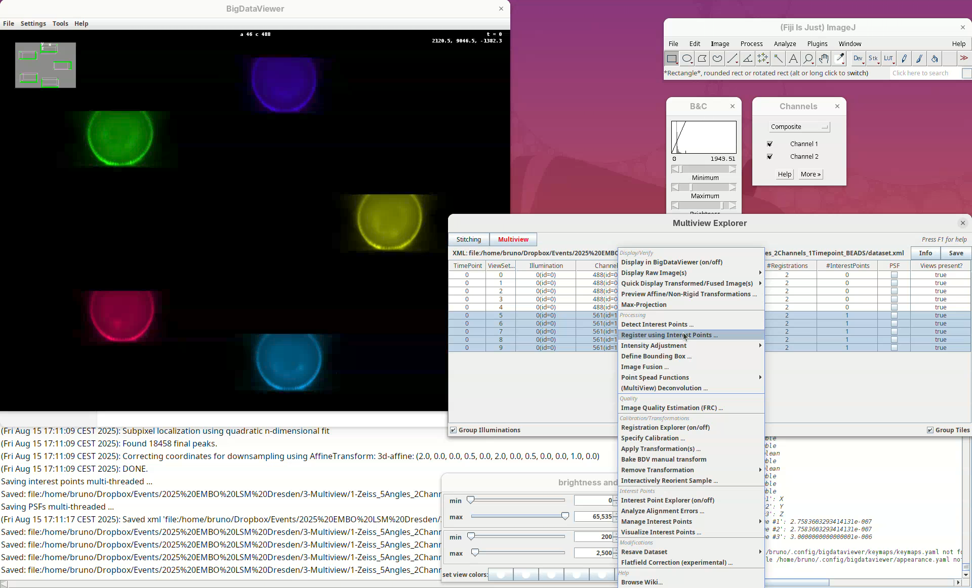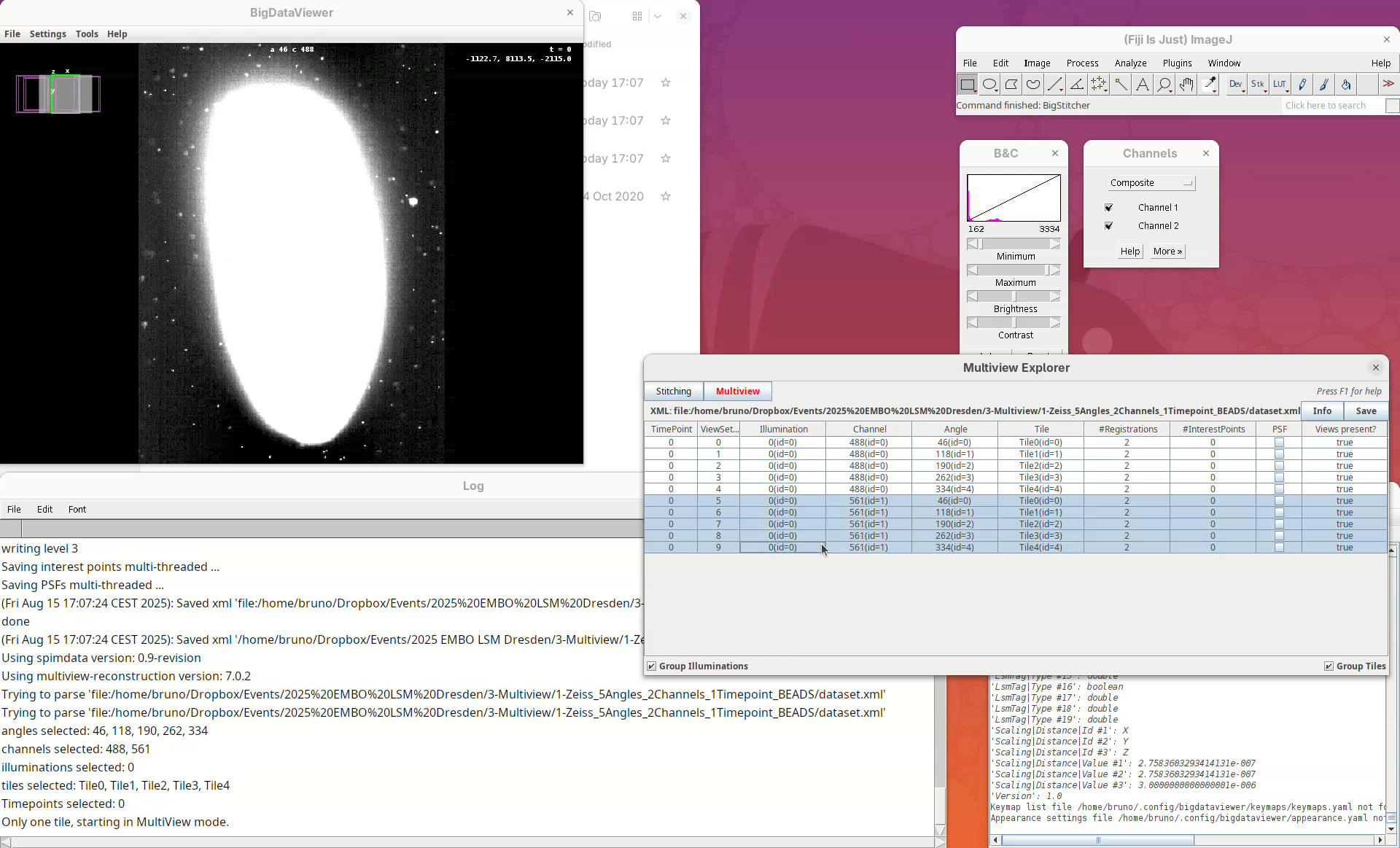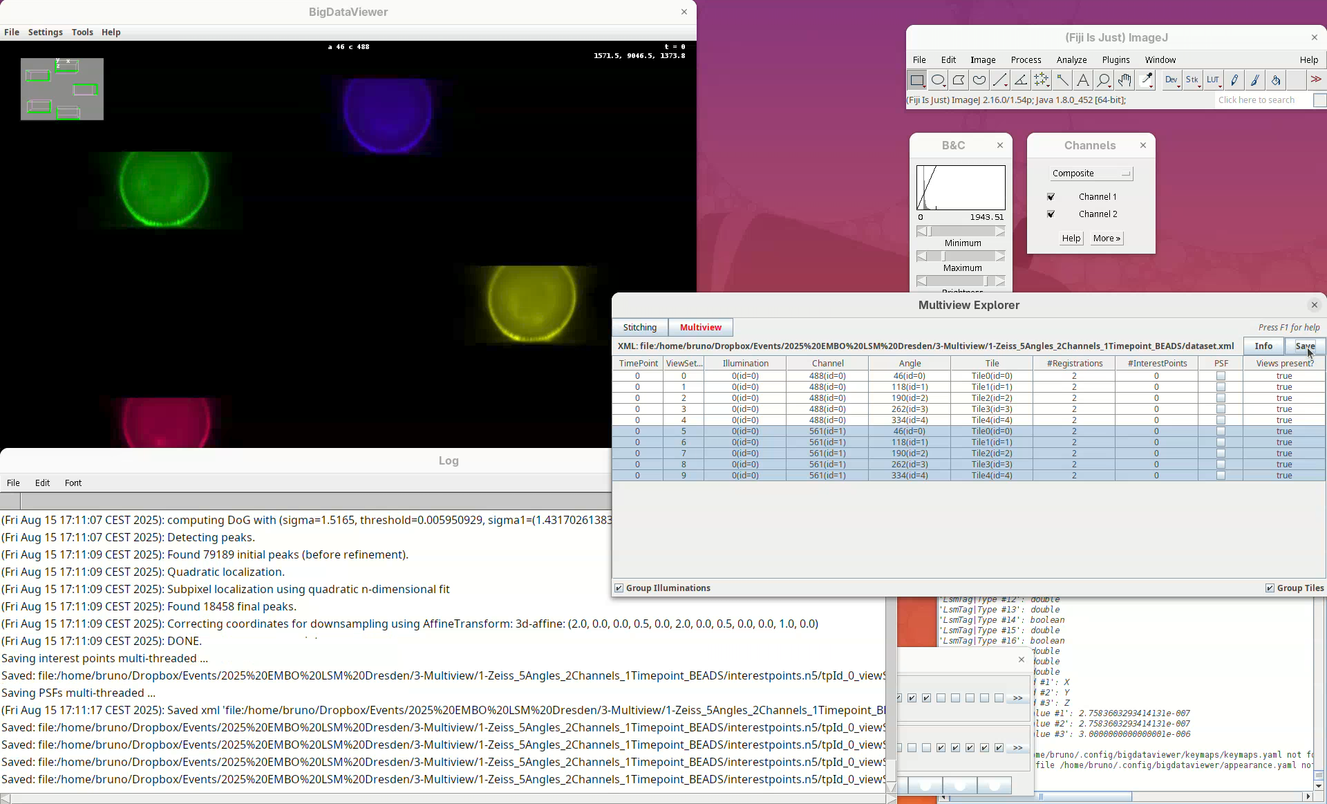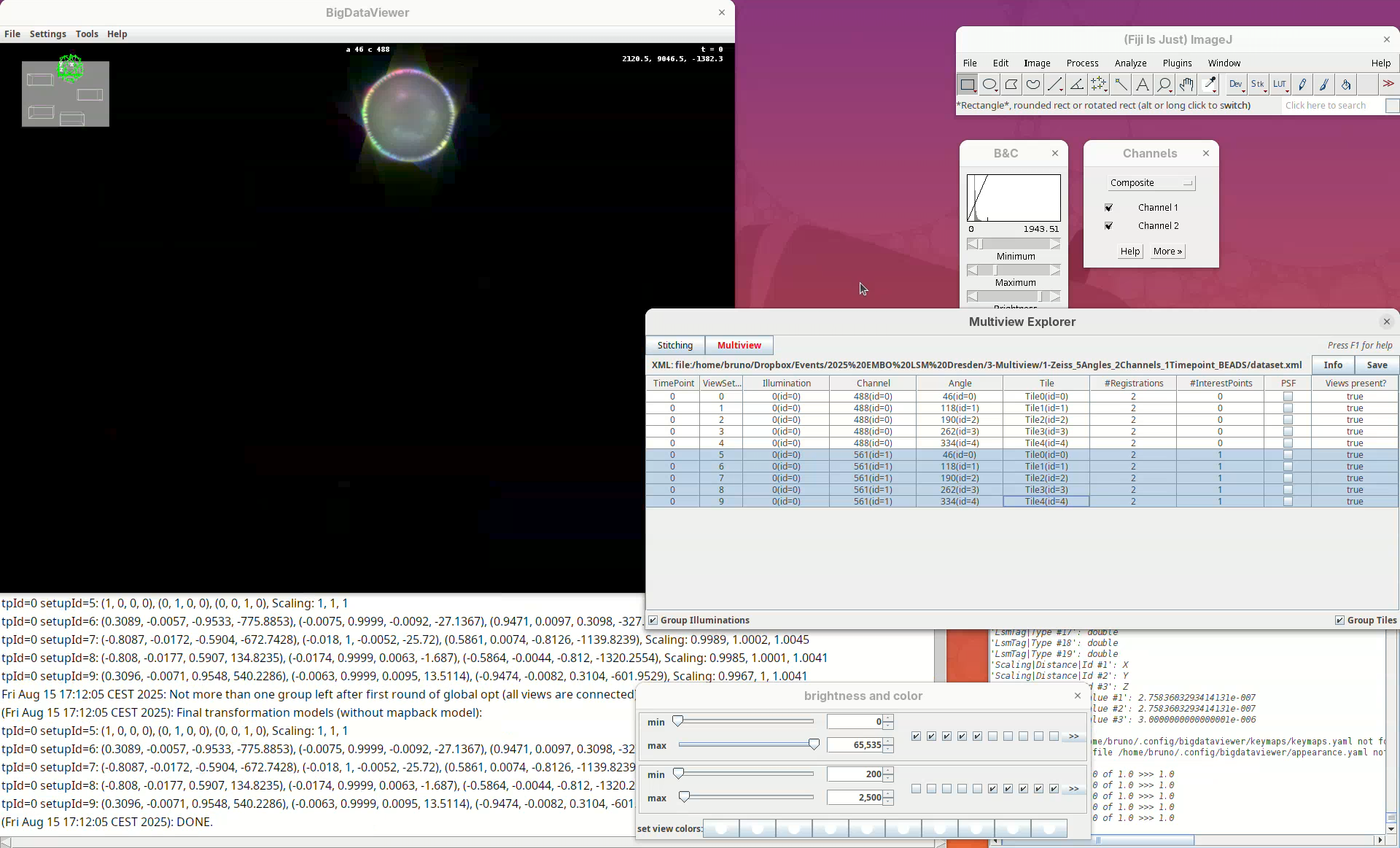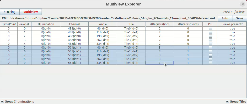 - Open BigStitcher again and check if the 5 views of the other channel are registered (they should be).