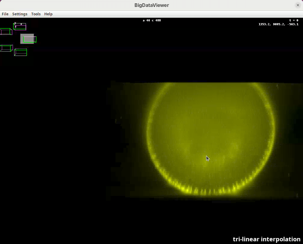 Now that we have successfully registered and fused the views of one channel, we can simply apply the series of transformations to the other channel without the need to detect interest points or register the channel independently.