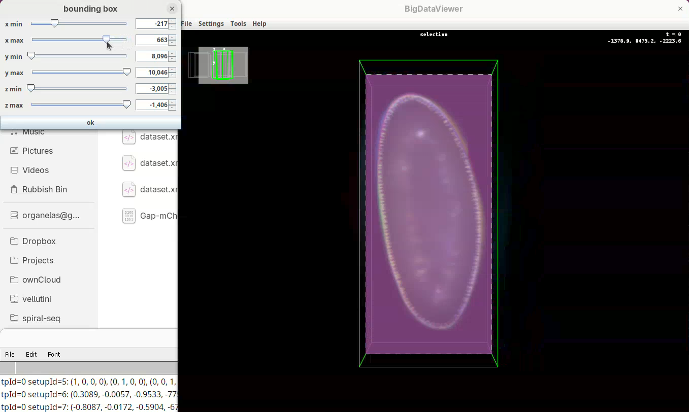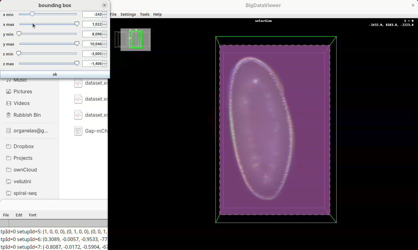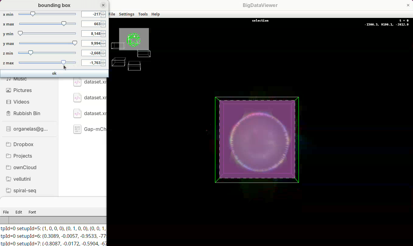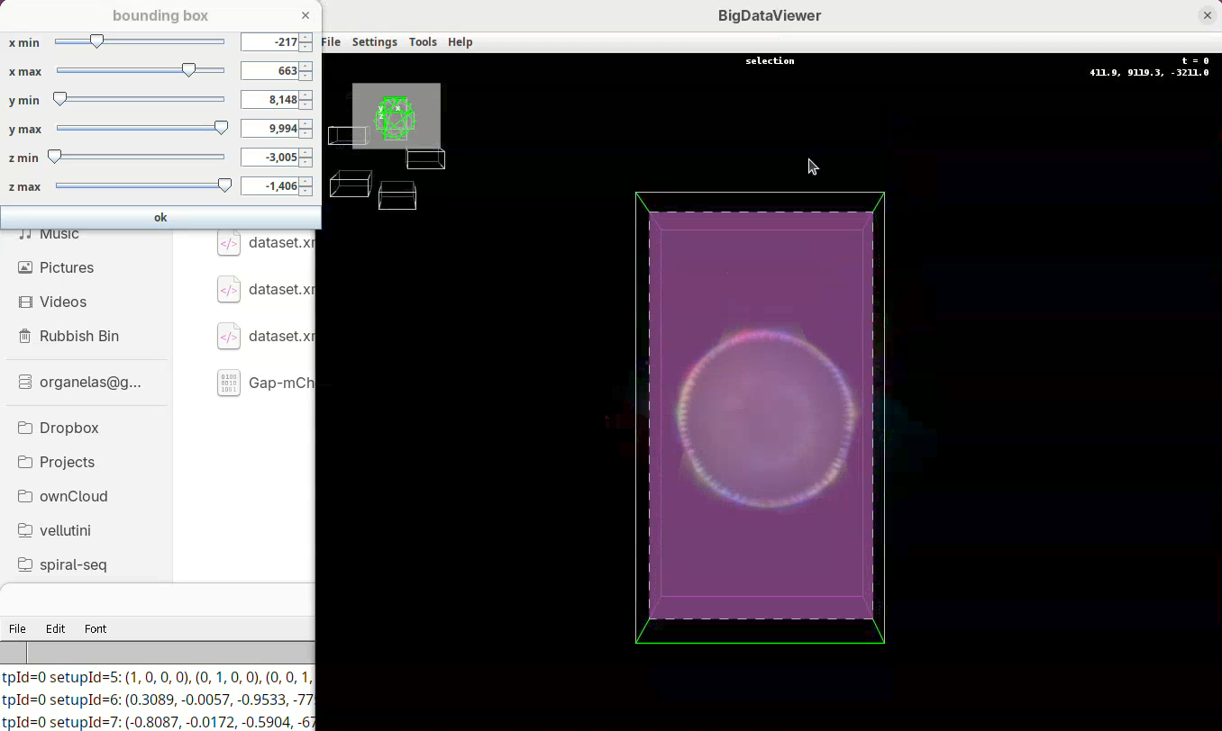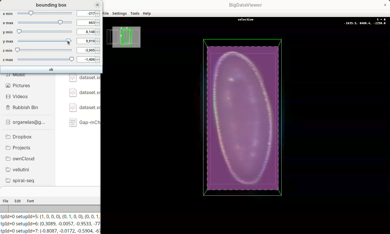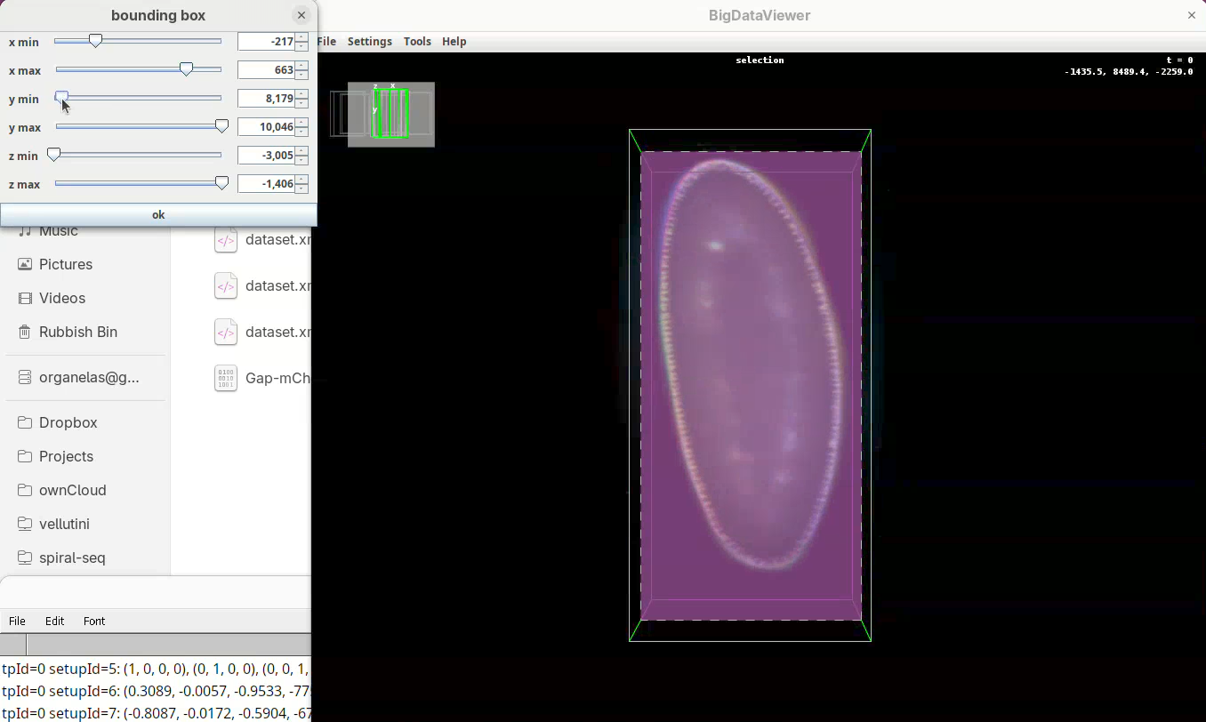 Two windows will open: BigDataViewer with the sample and some purple shade and a bounding box window full of sliders.