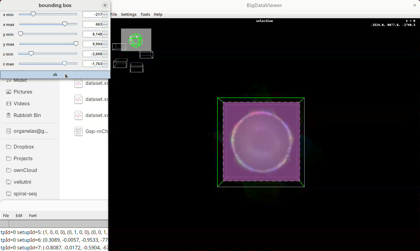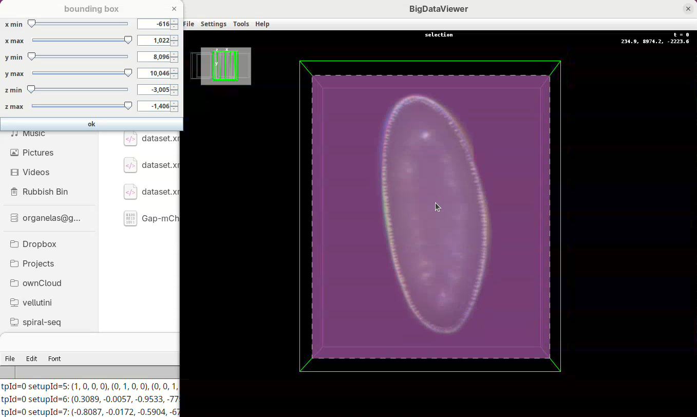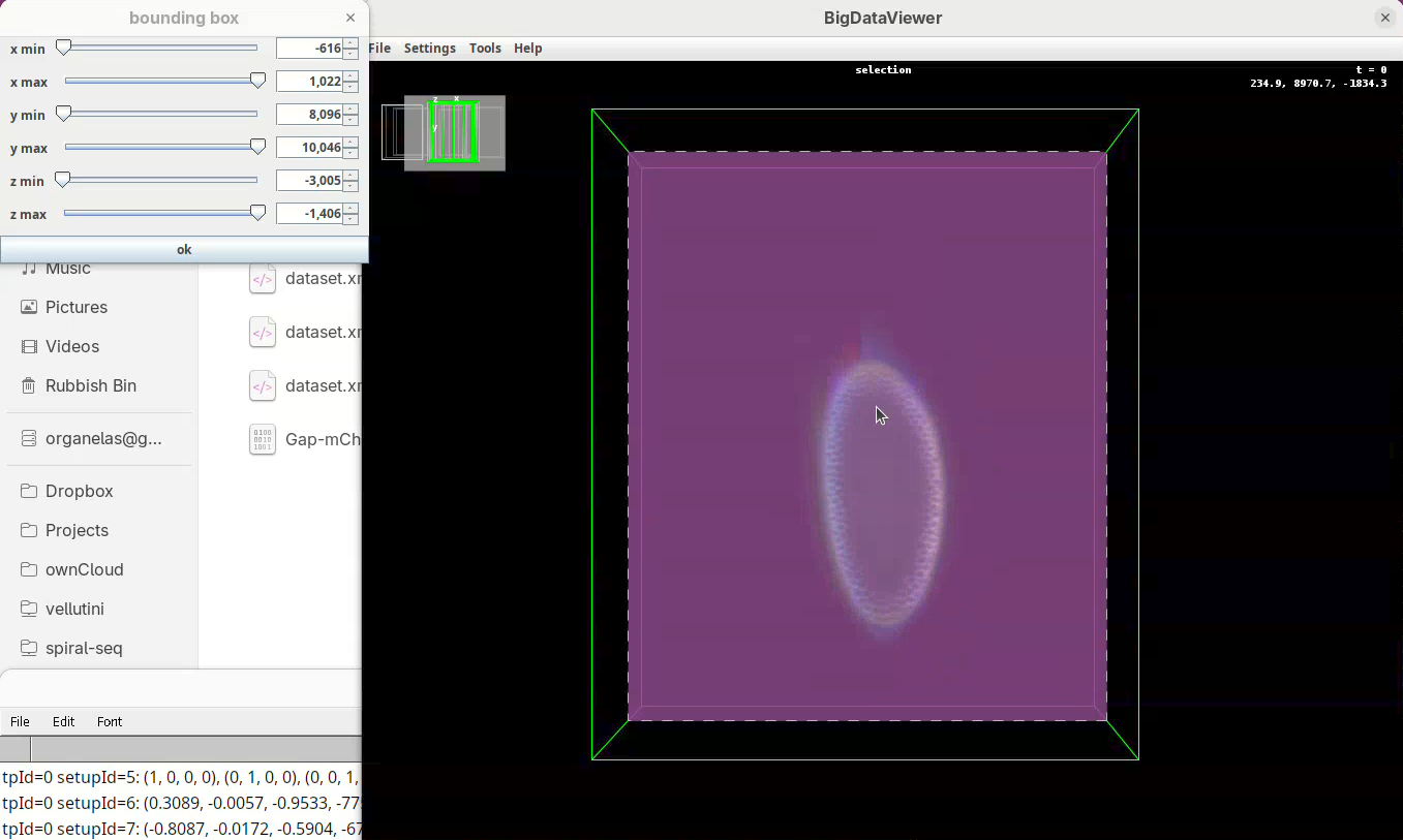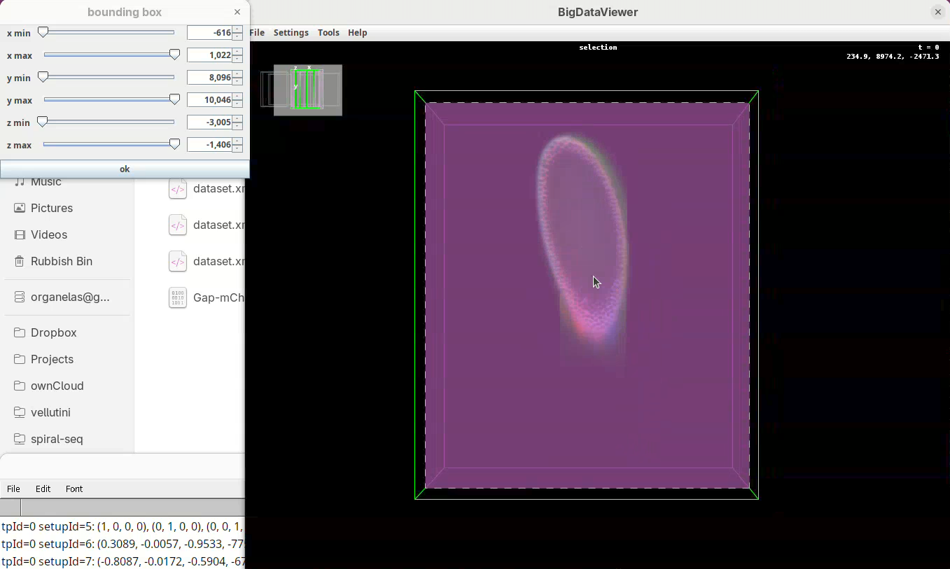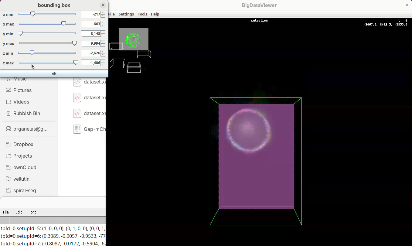 Two windows will open: BigDataViewer with the sample and some purple shade and a bounding box window full of sliders.
