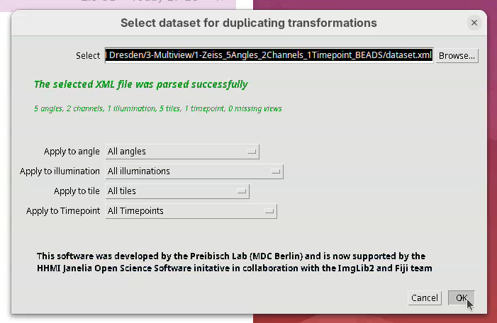 The new window Select dataset for Resaving as HDF5 will automatically load the last used XML file, in this case, our dataset.xml. We can choose whether we want to convert every angle, all channels, all timepoints, or only a subset of those.