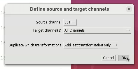 The last option, Duplicate which transformations is important. Generally, Replace all transformations works for most cases. However, I often prefer to use Add last transformation only. This will take the last transformation from the source channel and apply it to the target channel. For this to work, however, the source channel can only be one transformation ahead of the target. If, for instance, we had run two subsequent transformations on the source channel, then applied only the last one to the other channels, we would not entirely duplicate all the transformations between the channels. So, always check the #Registrations in the Multiview Explorer to be sure if only the last duplication would work, or simply replace all transformations.
