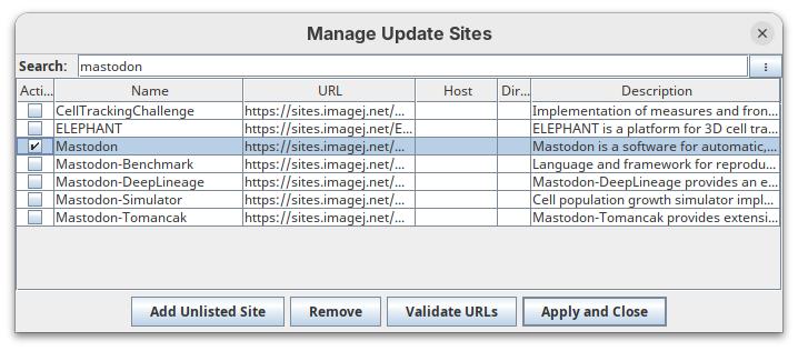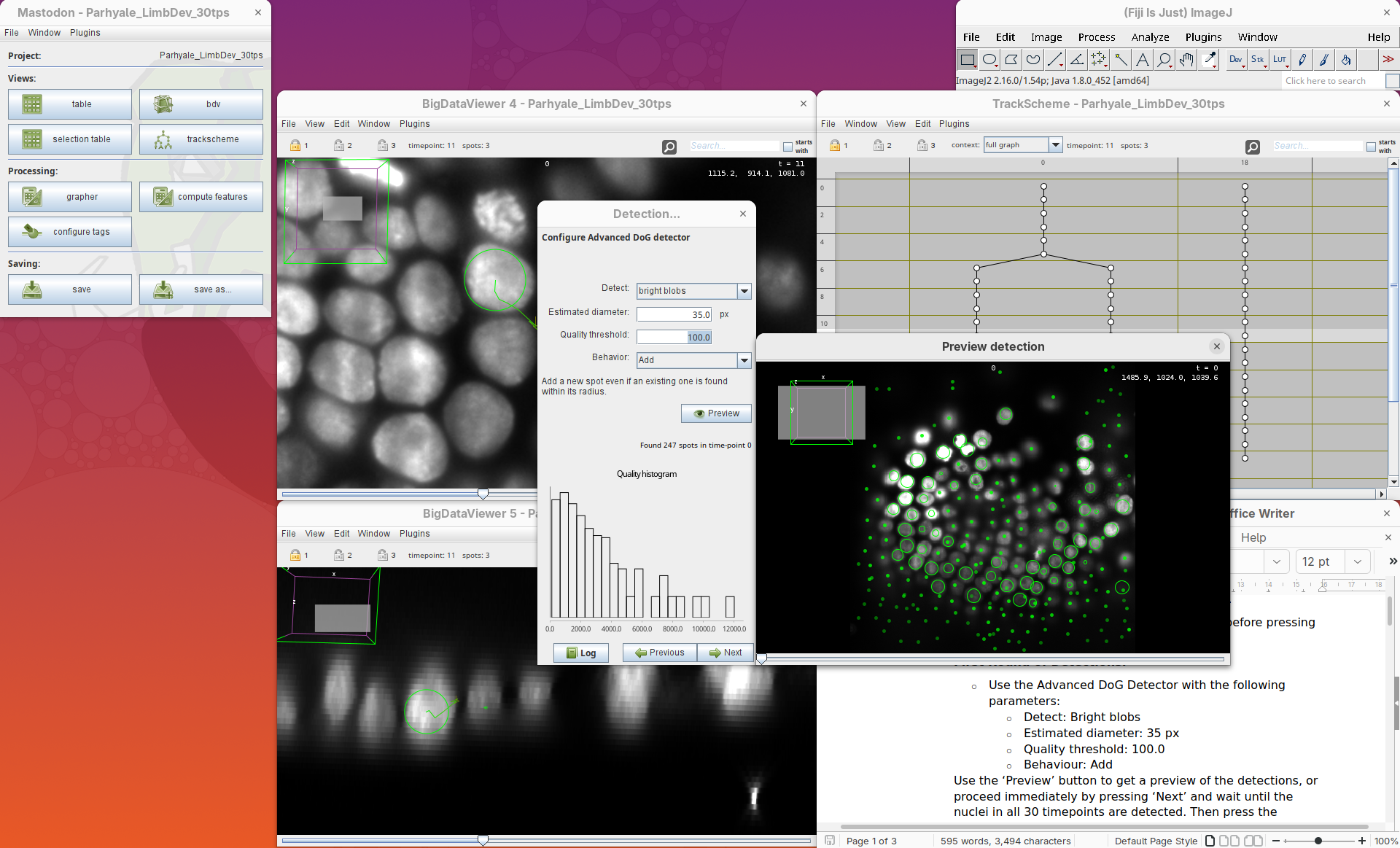 This is a basic tutorial on how to track cells in Fiji (Schindelin et al. 2012) using Mastodon (Girstmair et al. 2025). The goals are to learn how to load and create Mastodon datasets, get familiar with navigating the BigDataViewer and TrackScheme windows, perform manual cell tracking with cell divisions and simple editing of lineages, perform semi-automated detection and tracking, and try some lineage analysis. We will use a demo Mastodon dataset (Girstmair 2024) generated with lightsheet data from the isopod Parhyale hawaiensis (Wolff et al. 2018). For more information and detailed instructions, please check Mastodon’s official documentation.