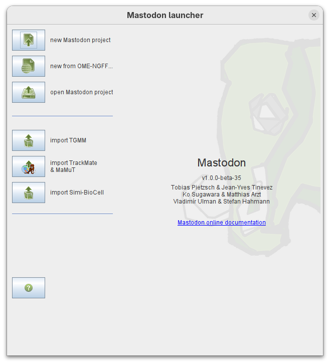 This is the main project menu from where we can open windows, set options, process data and save the project. The most important buttons for this tutorial are bdv (BigDataViewer) and trackscheme.