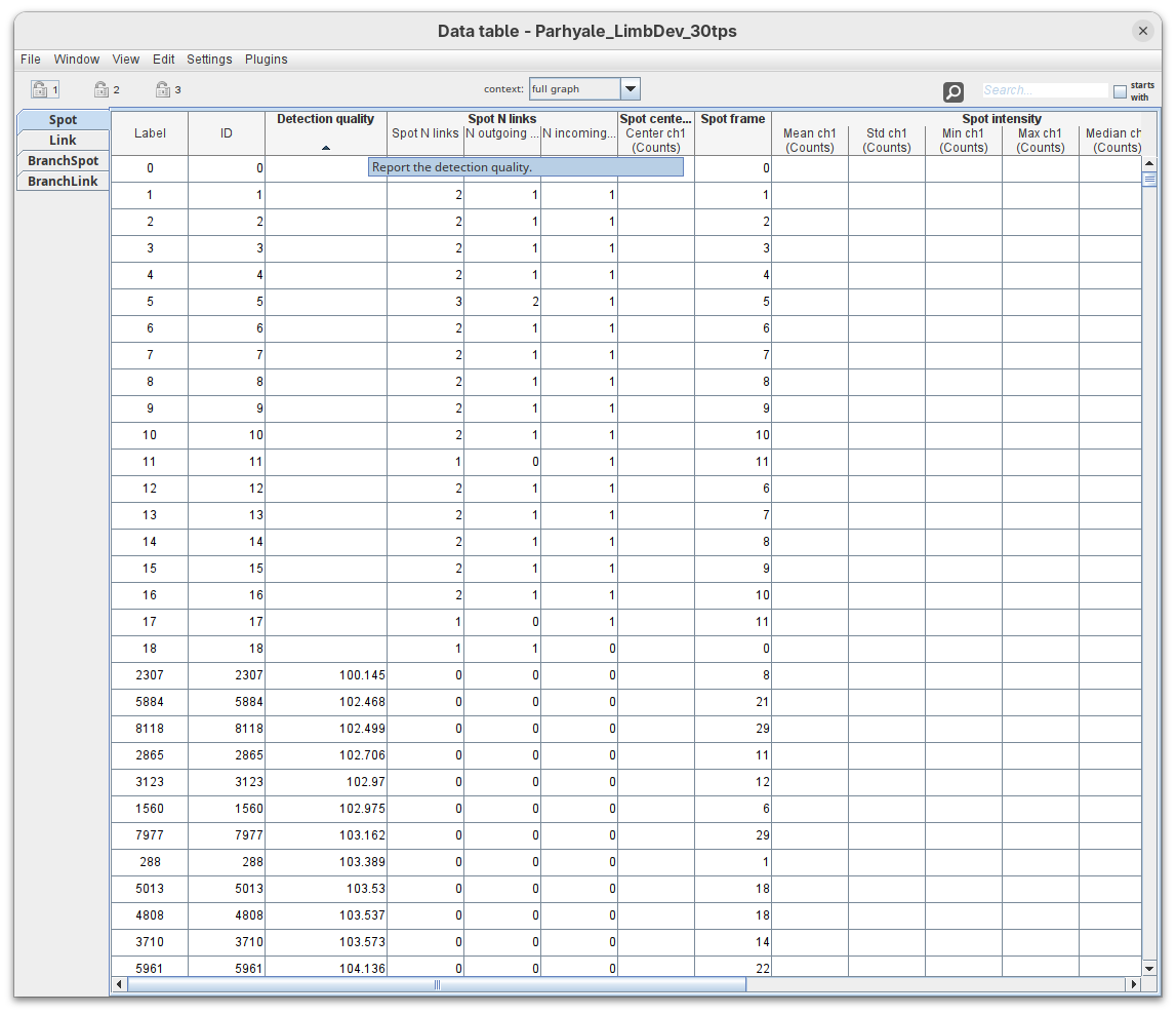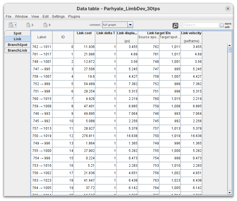 Mastodon can calculate features (position, displacement, velocity, etc.) of individual spots, links and branches. Let’s do that.