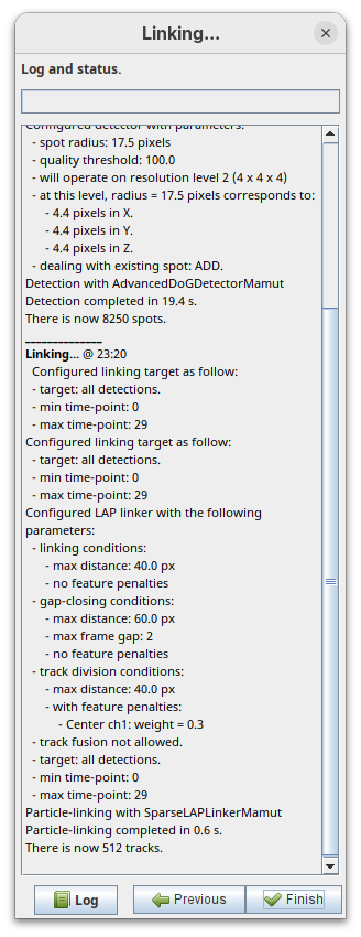 The final part of this tutorial is to try automatic detection and linking of spots. This is the dream: loading data and getting out a full lineage. However, in practice, it’s a lot messier. Cleaning, fixing, and curating the data is required to get a nice informative lineage. We will use a simplified version of the protocol included in this demo dataset. It is described in the file Protocol_Auto-Detection_Auto-Linking.docx.