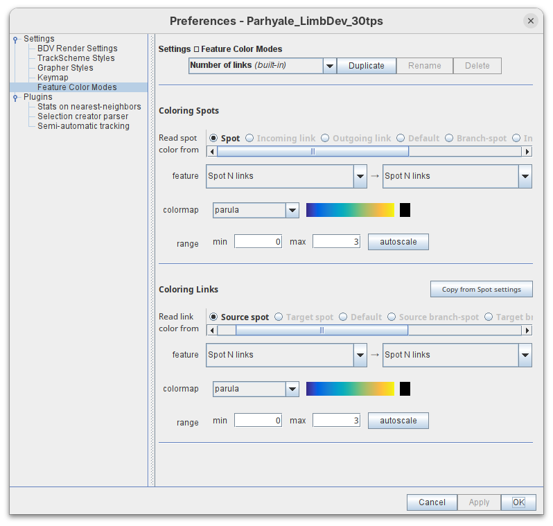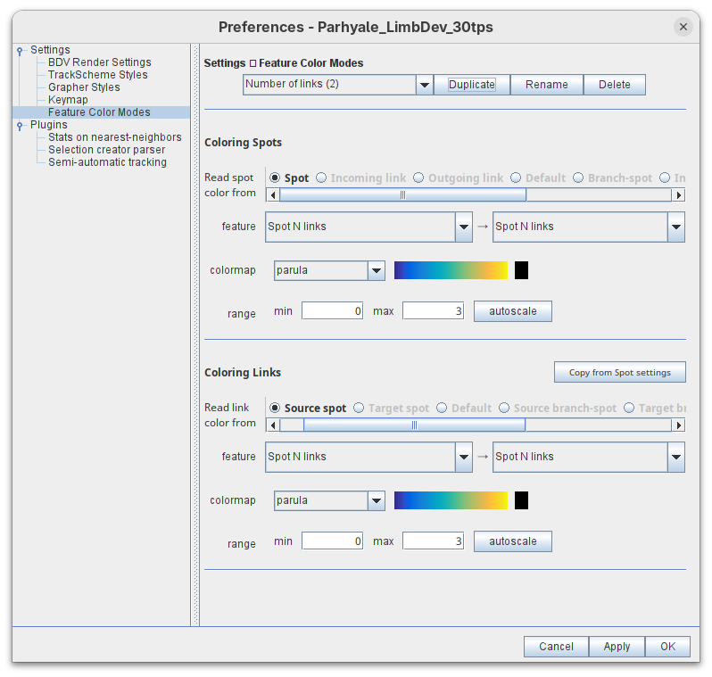 BigDataViewerwindow pressFile>Preferencesto open the feature color coding visualization parameters.