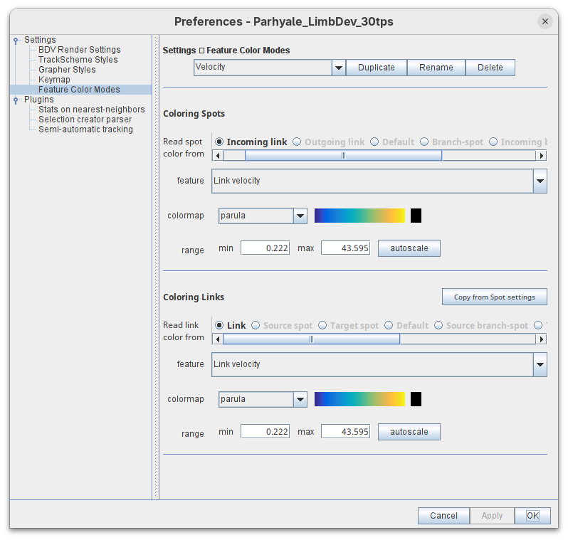 Coloring SpotschangeRead spot color fromtoIncoming linkand changeFeaturetoLink velocity. Then click onautoscalein the range. - On the